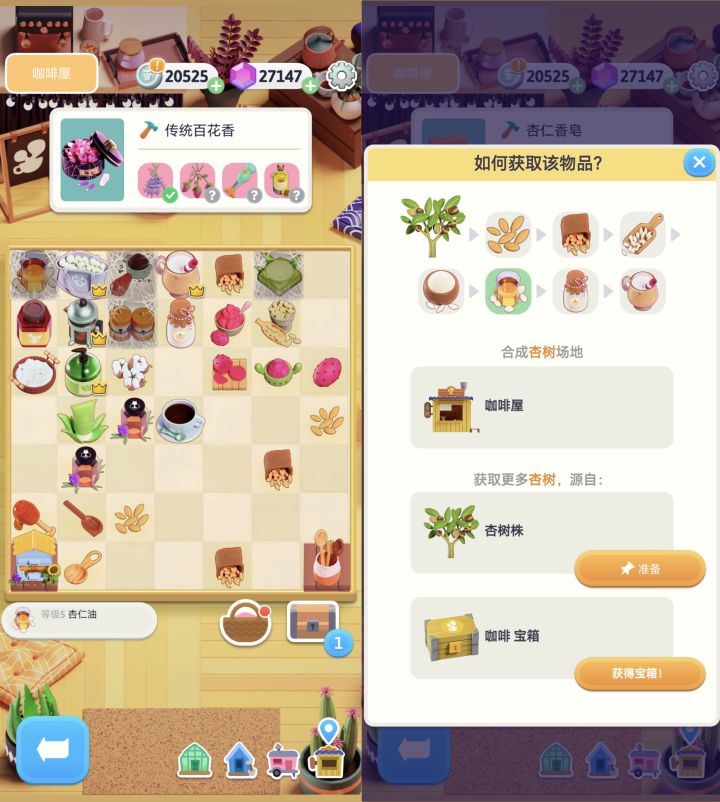 在这款合成类游戏中,制作杏仁拿铁需要玩家掌握正确的合成步骤和材料搭配,以下是详细攻略:基础材料收集1️⃣ 咖啡:作为咖啡饮品的灵魂,浓缩咖啡需要通过合成咖啡树株来制作。2️⃣杏仁奶:杏仁奶是杏仁拿铁的核心材料之一,可以通过种植杏仁树并合成来制作。3️⃣勺子:用于搅拌和添加材料。核心合成步骤🔸 STEP 1:咖啡的制作🌱材料获取温室:首先需要种植咖啡树株,在温室中用【咖啡树苗+肥料溶液+
