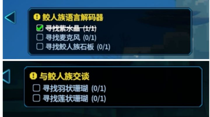 第一次和鲛人对话时听不懂鲛人说的话,于是需要寻找材料做翻译器(鲛人族语言解码器)做翻译器的紫水晶大家应该都知道在哪里,进入深海开黄箱拿到镐头,就可以挖紫水晶了,一般紫水晶附近的黄箱都能开出镐头,要注意紫水晶附近可能会有瞻星鱼紫水晶和镐头↓麦克风在浅海地图左下角的遇难船里面(约110米深度)麦克风↓鲛人族石板在浅海地图右下角的鲛人档案室里面(约90米深度)鲛人石板族↓要注意晚上夜潜是进