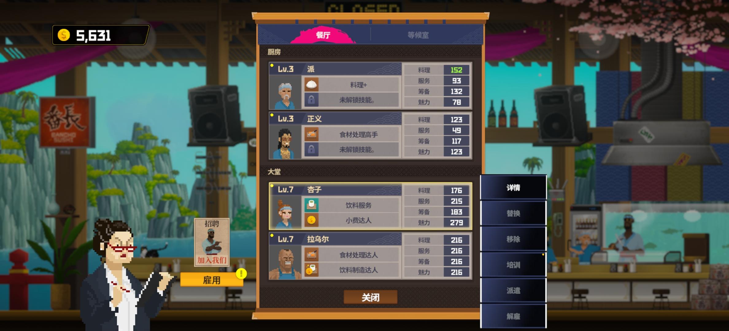可以升级服务员,注意“服务”评分,升级服务员可获得自动 倒茶 倒酒 功能