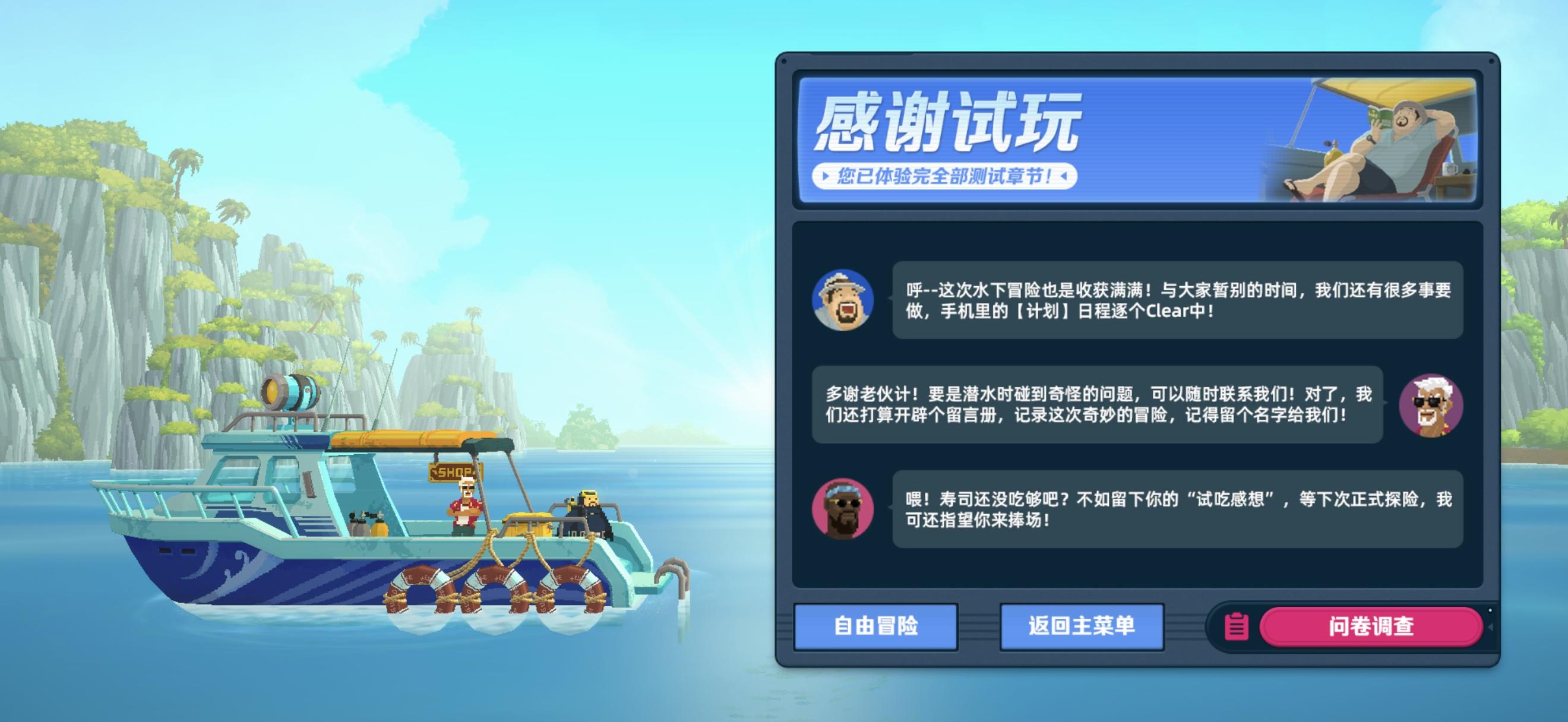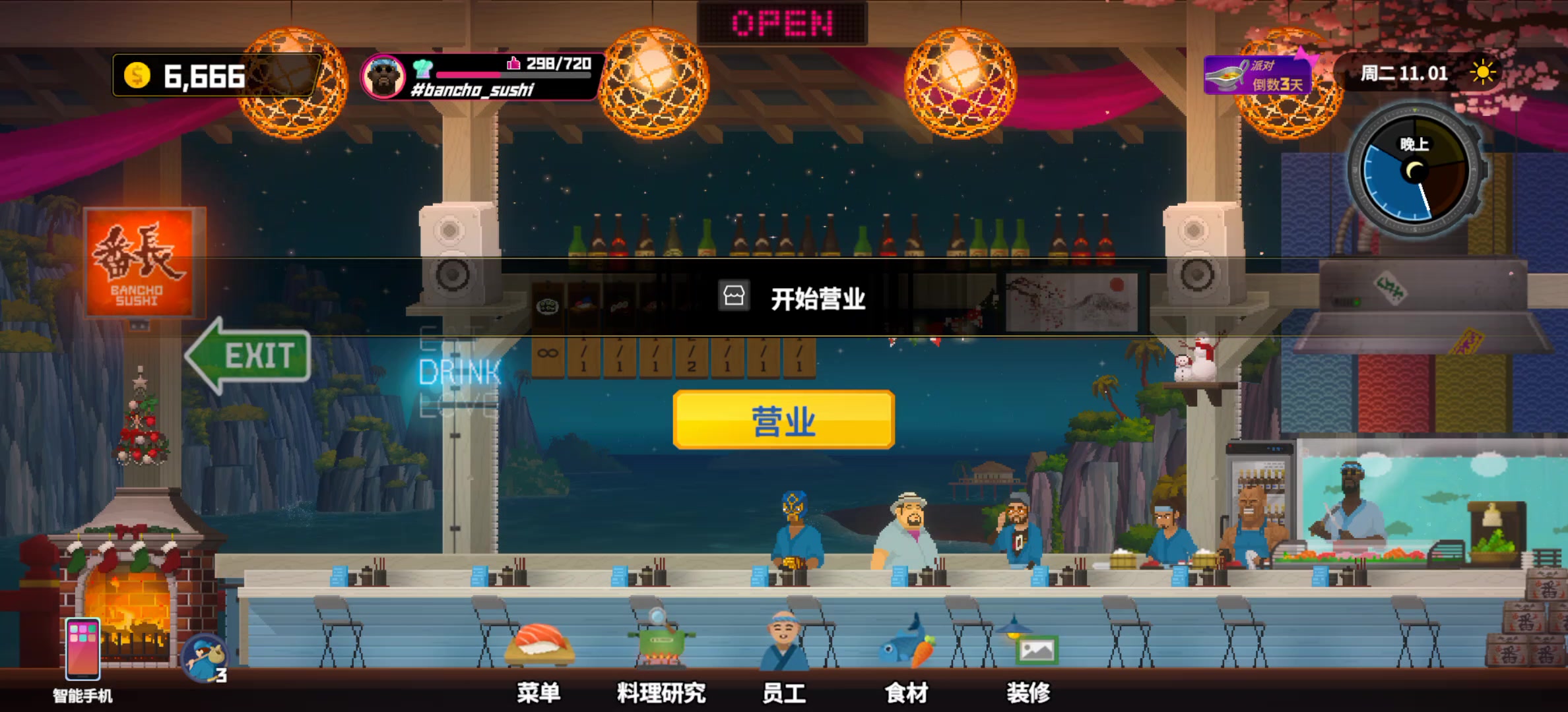 每天晚上都是等好几秒钟,只有一个人进来 ,等他吃完喝完出门了又会进来一个跟他一模一样的人 然后才来客流,浪费得有四分之一营业时间还有,手机端要是一直在线不退出游戏 就会越来越卡 交互卡 碰见交互键都卡 屏幕上出现说明也卡,得退出重进才流畅#潜水员戴夫