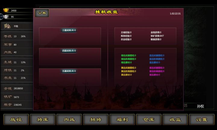 第一天建议,开放国战 1.阵营分为魏蜀吴群雄4大阵营 2.每个阵营有专属阵营buff 3.每月1-5号设置阵营兼报名 每月6-25号,每名玩家可选择进攻,每天5次进攻机会,赢了增加阵营积分和个人积分。 4.不同战力段玩家积分不一样。 5.每月26-31号结算奖励,分为阵营积分奖励和个人积分奖励