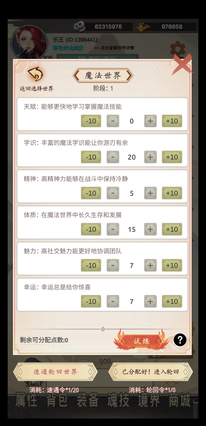 世界评分:一败涂地,2分点数分配:学识7点、精神5点、幸运2点本世经历:第1段:你选择成为治疗法师,目前看来是适合你的!(+1分)第2段:导师的讲解深入浅出,但你似乎对魔法的波动总是不太敏感,进展缓慢。(+1分)因魔法天赋平平,常被同龄人嘲笑为“魔法小白”,只能默默在图书馆自学。(-1分)第3段:尽管学院资源丰富,你却发现自己对大多数魔法都只能勉强掌握,难以深入。(+1分)在魔法课上与同