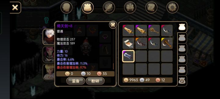 暴击伤害的计算应该是=普攻伤害(DMG) ✖️ 暴击倍数(C.DMG)比如倚天剑,爆伤➕的高,但是面板低,可强化次数低例如200面板,300%爆伤伤害肯定不如300面板,280%爆伤的,很简单的计算题像下面这个嗜血狂剑,才能称得上毕业武器(暴击流忍者),有面板也有爆伤所以可不可以得出结论:面板差距不能过大,否则属性再好也是白搭(同攻速下)就比如我图里的倚天剑和真实之剑,肯定是后者伤