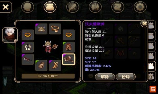 歌颂黑暗的禁书 LV 93沃夫兰战斧(毒斧头 )天使之盔倚天剑(暴率暴伤单手剑 )古代变种毒蜘蛛 LV 94亡者的斗篷破灭之牙(毒属性匕首 原攻击力为145/159 不小心强化了= = )知识之冠背叛者的遗骸 LV 95智慧头巾斩灵之剑(双手剑 )破灭之火球(毒属性魔法球 , 喜欢打带跑虐死小王的应该蛮适合 我第一次玩的时候很爱这个 )无法控制的石巨人 LV 97斗士之盔