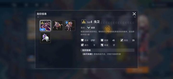 【金色荒野】各种各样的刻印横行,今天,咱们接着看一看其他刻印~ 虫卫 虫卫是噬源虫巢的高级单位,擅长使用锋利的爪子,穿透目标的躯体,是虫群的中坚力量。它的刻印技能【跃爪突袭】可以让虫卫原地跃起并爪击,对目标造成攻击伤害。虫卫属于强袭类,尤其惧怕指挥官的巡空克制。锋镰兽 锋镰兽是噬源虫巢的中级单位,拥有一对源能附魔的上肢利刃对敌方造成极高伤害,其刻印技能【攻袭流血】可以对敌方造成流血。