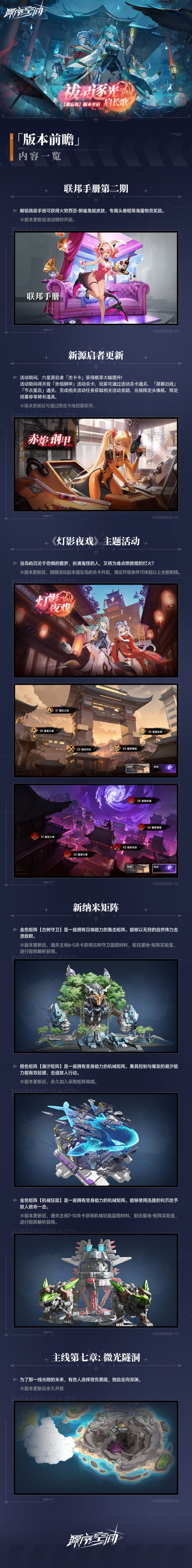 亲爱的指挥官:感谢大家对《源序空间》的支持与厚爱!我们将于2025年11月26日凌晨 5:00 至中午 11:00 进行服务器维护更新,维护期间您将无法登录游戏,请提前安排好游戏时间。在正式服更新后,所有指挥官均可领取停机维护补偿:制能净珀*100/小时。一、【全新剧情、地图和怪物】主线第七章:「微光隧洞」7-11 至 7-20 关卡开放为了那一线光明的未来,有些人选择背负黑暗,独自走向