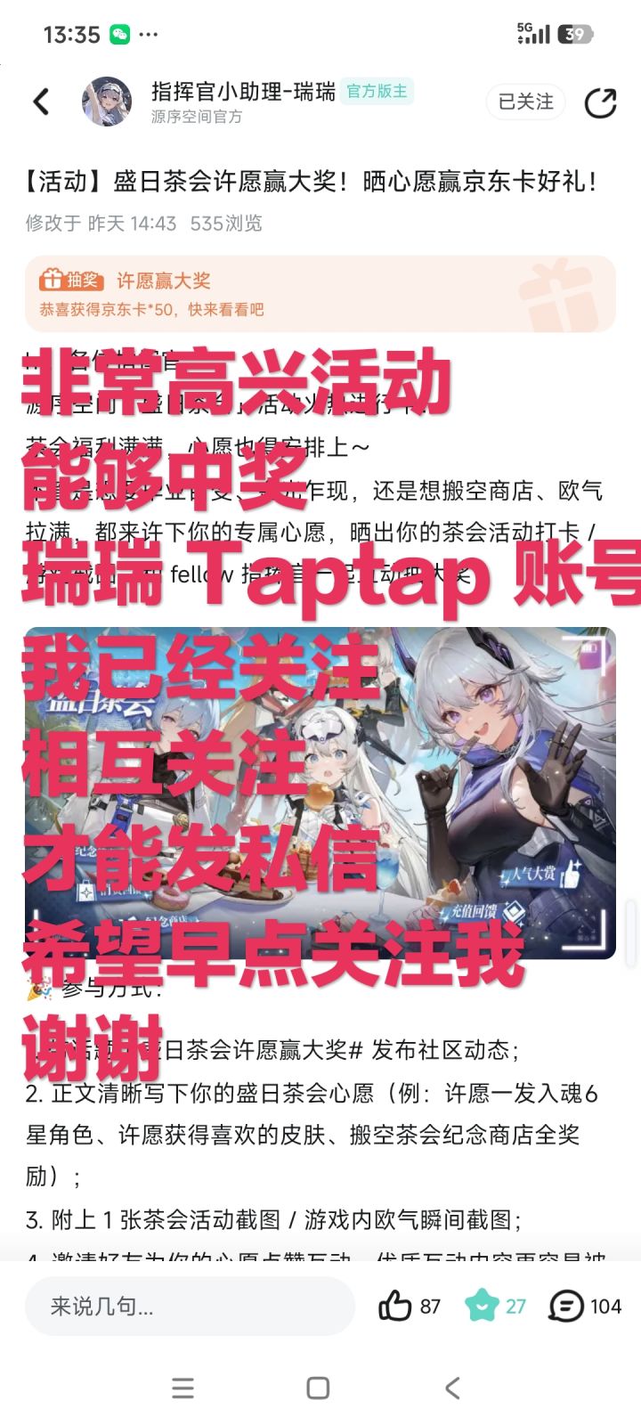非常高兴活动能够中奖瑞瑞 Taptap 账号我已经关注相互关注才能发私信希望早点关注我谢谢