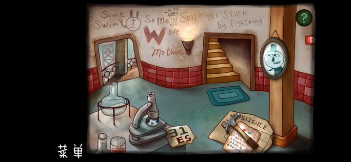拾取地上的锤子和纸,显微镜中细菌按照地上图纸排列(主页有视频)先排中间五个,后两边上下调整上行,捡碎片,锤子砸机器人下箱子得罐子右行,机器人想要照片右行,从细菌那得到的图输入门上灯下面的数字猜测可得 A9 C4 F3 I8 得下通道下行,拾取碎片,墙上有电压算法公司,还有除号,右行墙上得照片,给机器人得旋钮,给左边机器人,得到图谱药水给博士,得花,点卸下面具的博士得红蓝药丸墙上有象