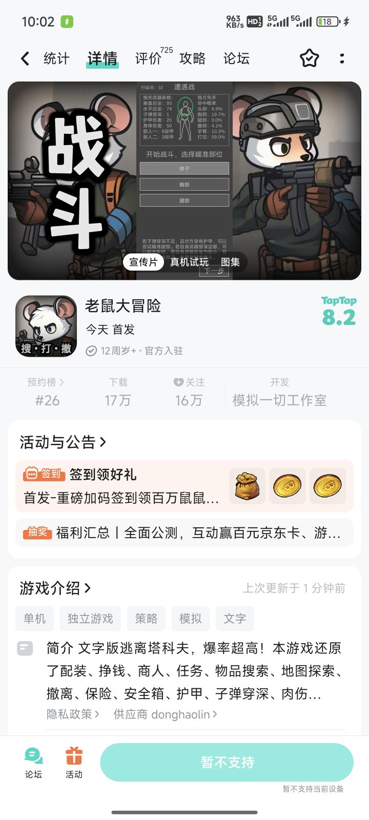 《老鼠大冒险》是类塔科夫“搜打撤”玩法文字版游戏,游戏独创文字回合制搜打模拟博弈真实摸金玩法!第一轮A测即将结束,敬请期待第二轮全面优化测试,即将开启!具体信息请看下面!〓《老鼠大冒险》第一轮测试结束通知〓-1.结束时间:2025年1月23日(周四)14:00PM2.测试类型:删档内测〓《老鼠大冒险》第二轮测试流程通知〓-1.测试时间:2025年1月26日(周日)9:00AM(滑轨~道歉