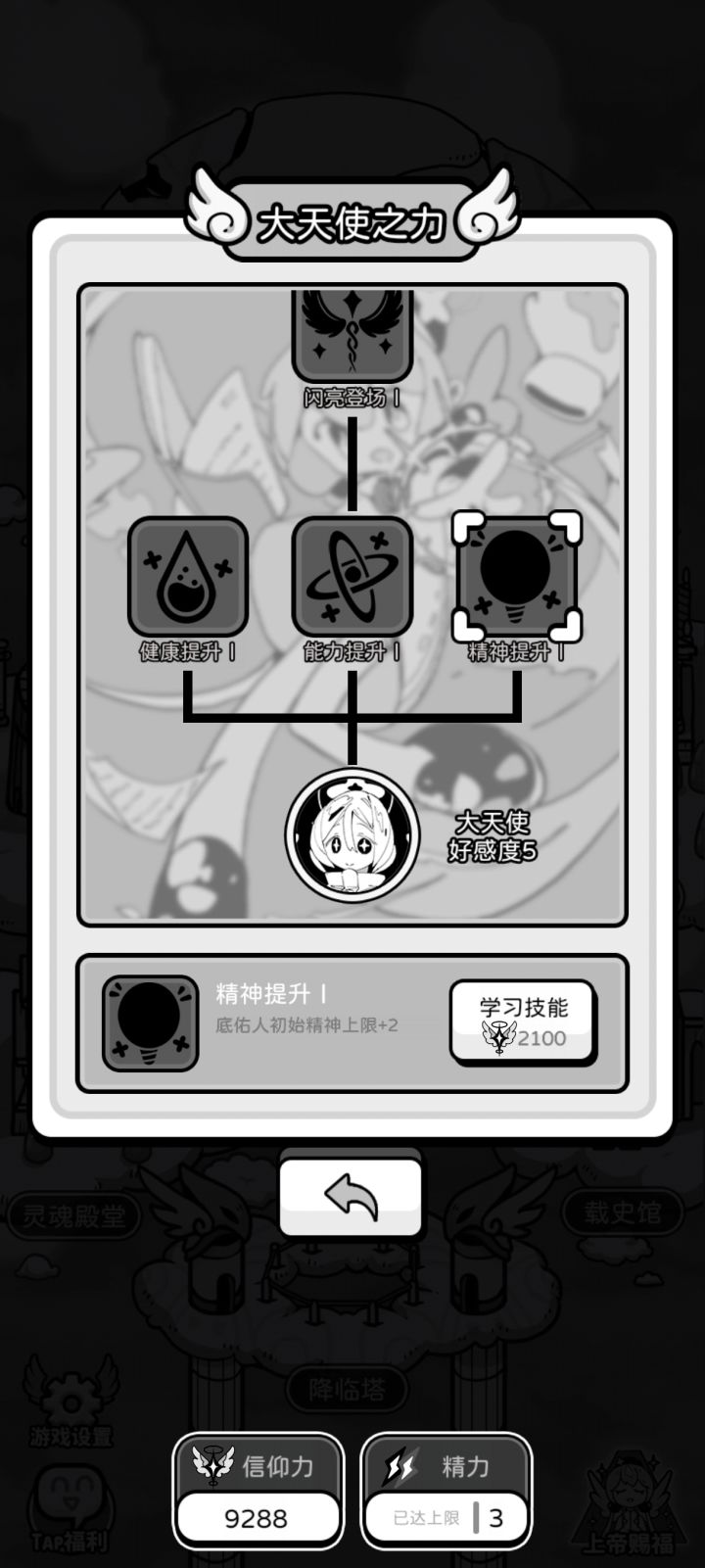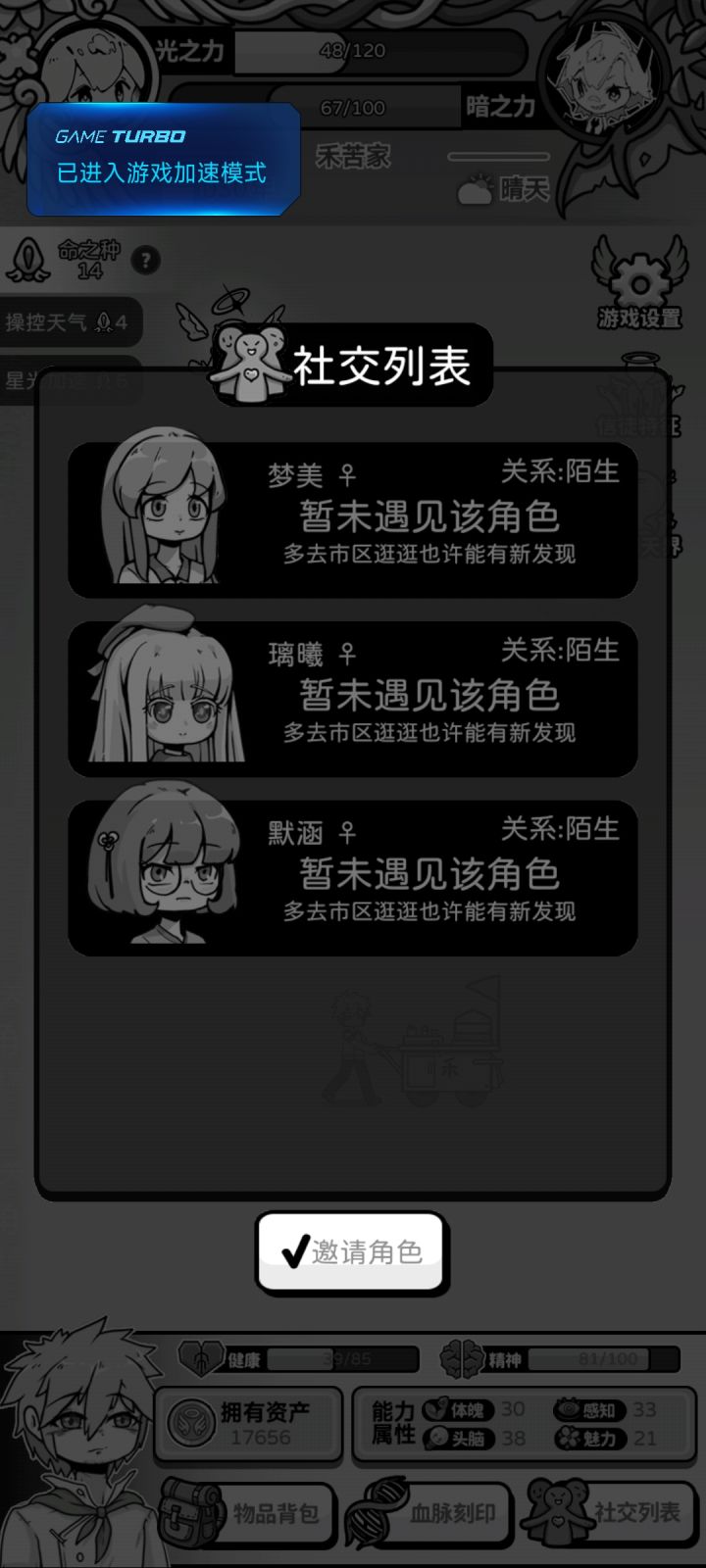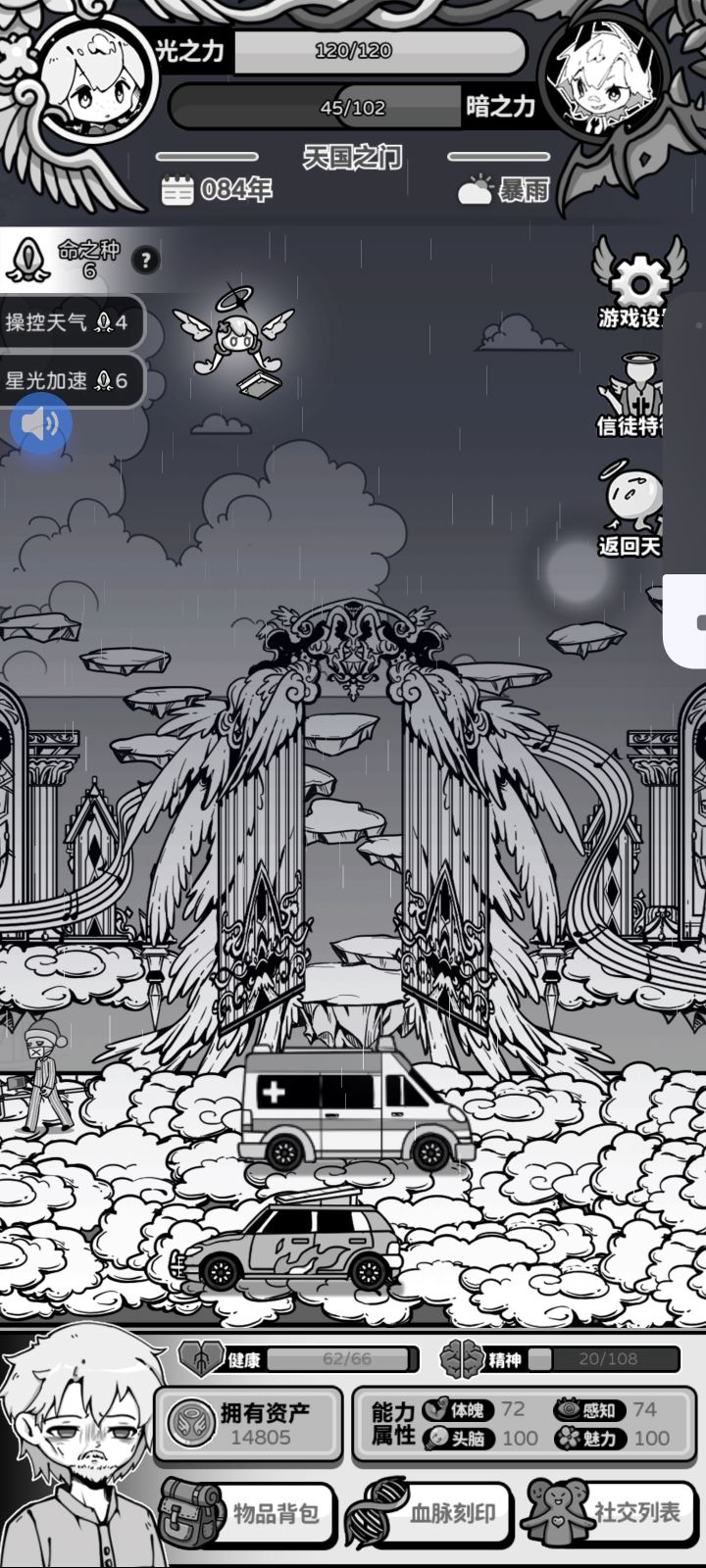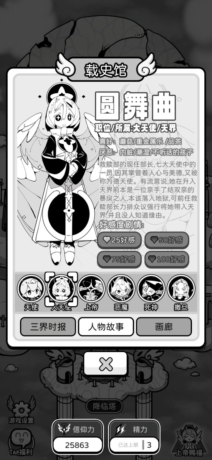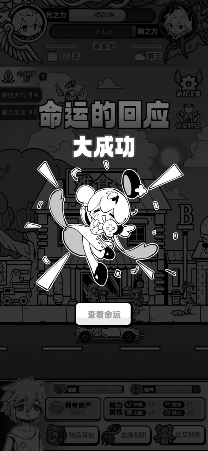 正面事件与负面事件的数值根本无法对刚,小恶魔每次降临带来的数值打击都是毁灭性的,而整个游戏的核心机制竟然全部都是只靠运气。和跑团和crpg完全不同,只靠运气,开了大半天游戏体验感都是极差的。如果你执意日常生活的守护事件是随机的,至少和恶魔死神的战斗需要存在一定可操作性吧,影响这么强的事件,一旦三次全部庇护失败有可能前面的努力全白费。你是一款游戏你需要保证最起码的用户体验,结果你数值和玩法根本没搭配