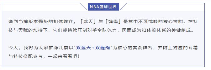 ※建队思路:本套阵容的核心是“双遮天+双缠绕”,并辅以「暴力美学」提供扣体。内线选用克拉克斯顿与莫布利组成双塔,在实现双遮天的同时,依靠「内线屏障」与「防守体系」降低犯规风险。外线选用米切尔和狂人(01)搭档,凑满「暴力美学」与「三分机器」。锋线则用JJ约翰逊收官,最终组成双「禁区王者」+双「缠绕」体系。若想增强内线防守与护框,可将克拉克斯顿替换为戈贝尔(20)、坎比(07)或德拉蒙德(18);
