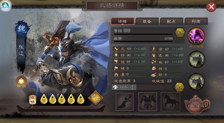 攻城配将手游《城防三国志》taptap版中,魏骑如何搭配?魏国骑兵将领比较多,而且每个武将都有自身的特点,今天我们聊一下,城防的魏骑怎么搞。首先我们看下,目前魏国骑将都有谁,魏王曹操、司马懿、荀彧、张辽、典韦、张郃,其中张郃是妥妥材料将,曹老板是不变的核心。曹操的指挥技能【奸雄霸业】,前三回合提升少量全属性,这个效果可有可无,主要看后面提升友军主动技能释放率,这个才是曹操的王炸。每两回合会有一个