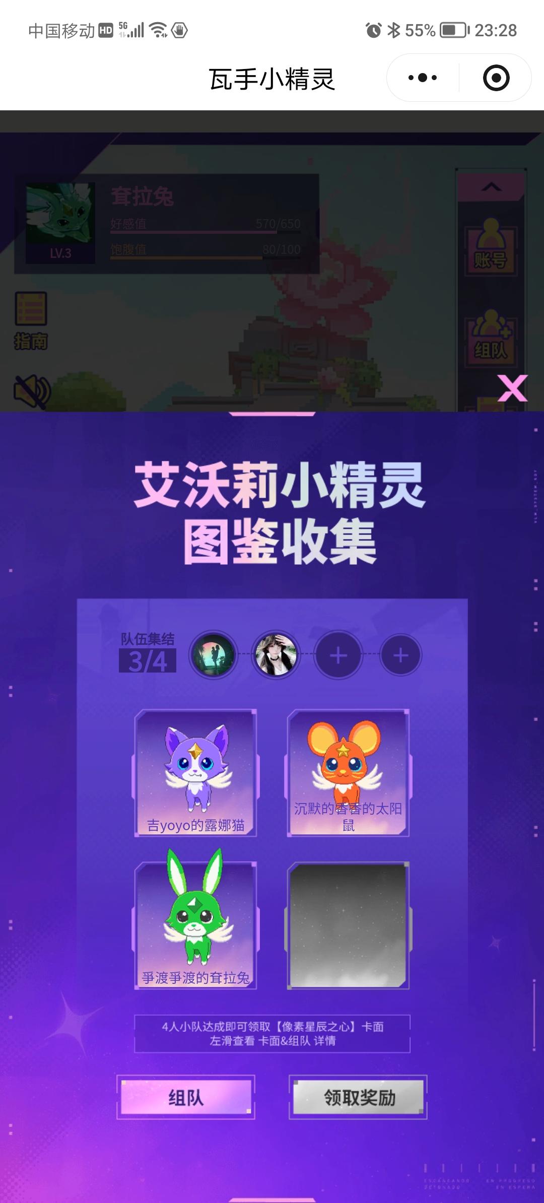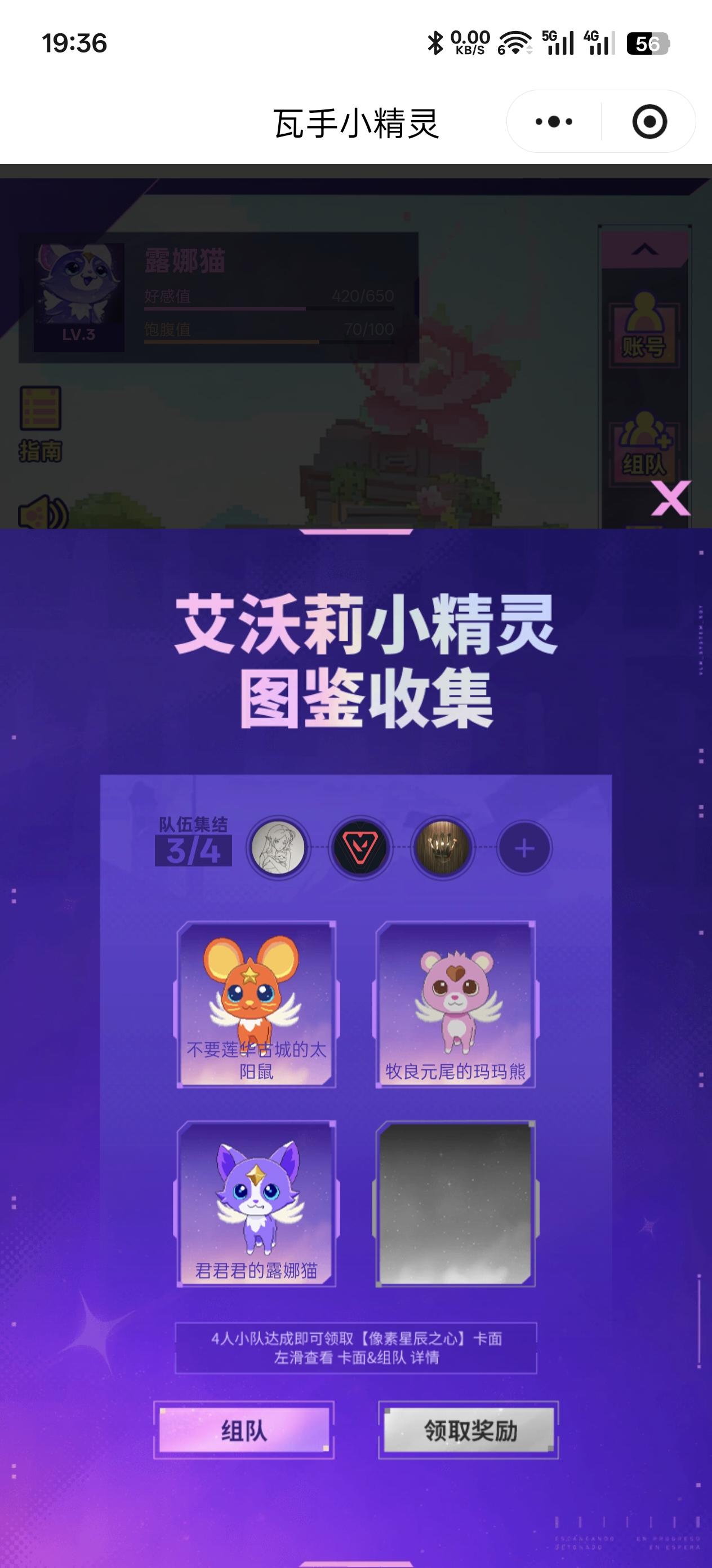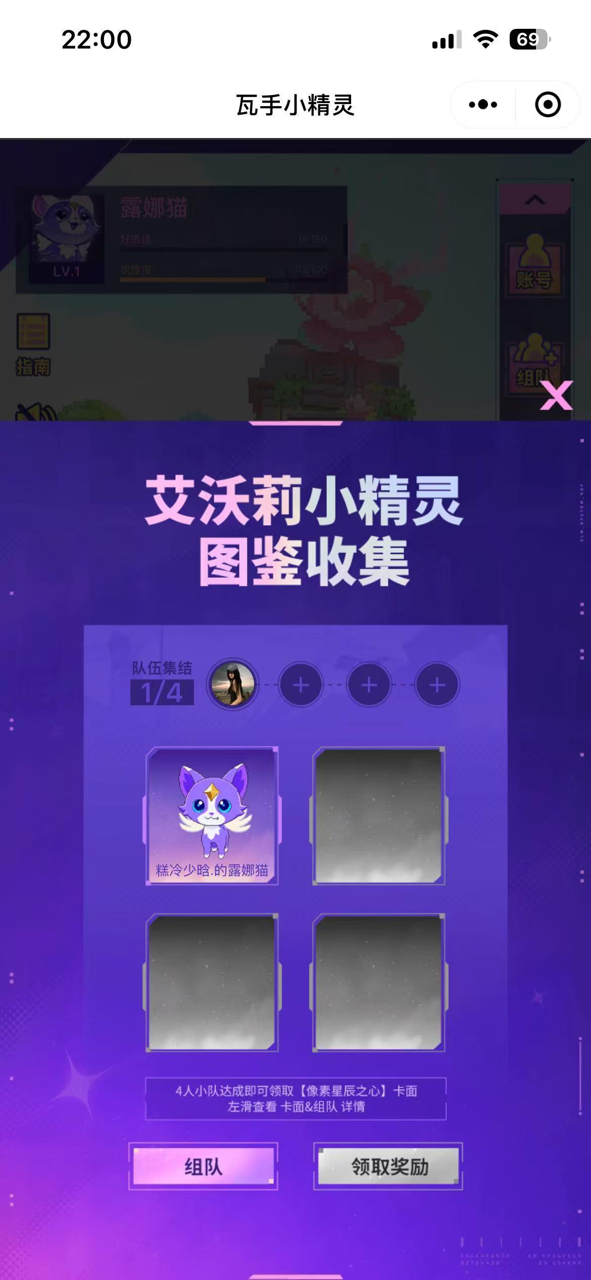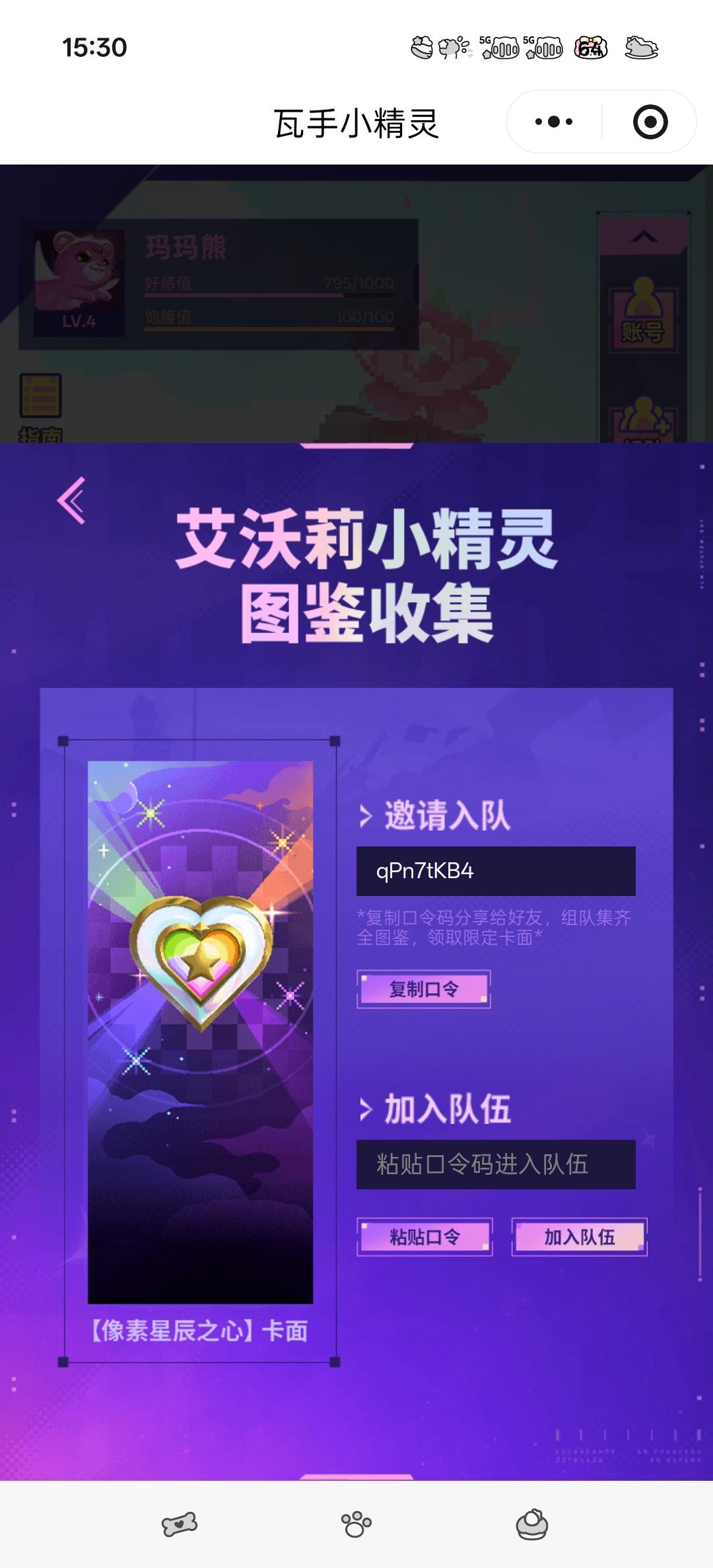 我在【瓦手小精灵】获得了契约小精灵【露娜猫】!小队目前还差太阳鼠/耷拉兔/玛玛熊即可全员获得限定卡面,复制口令0Unr6aGH加入我的小队!