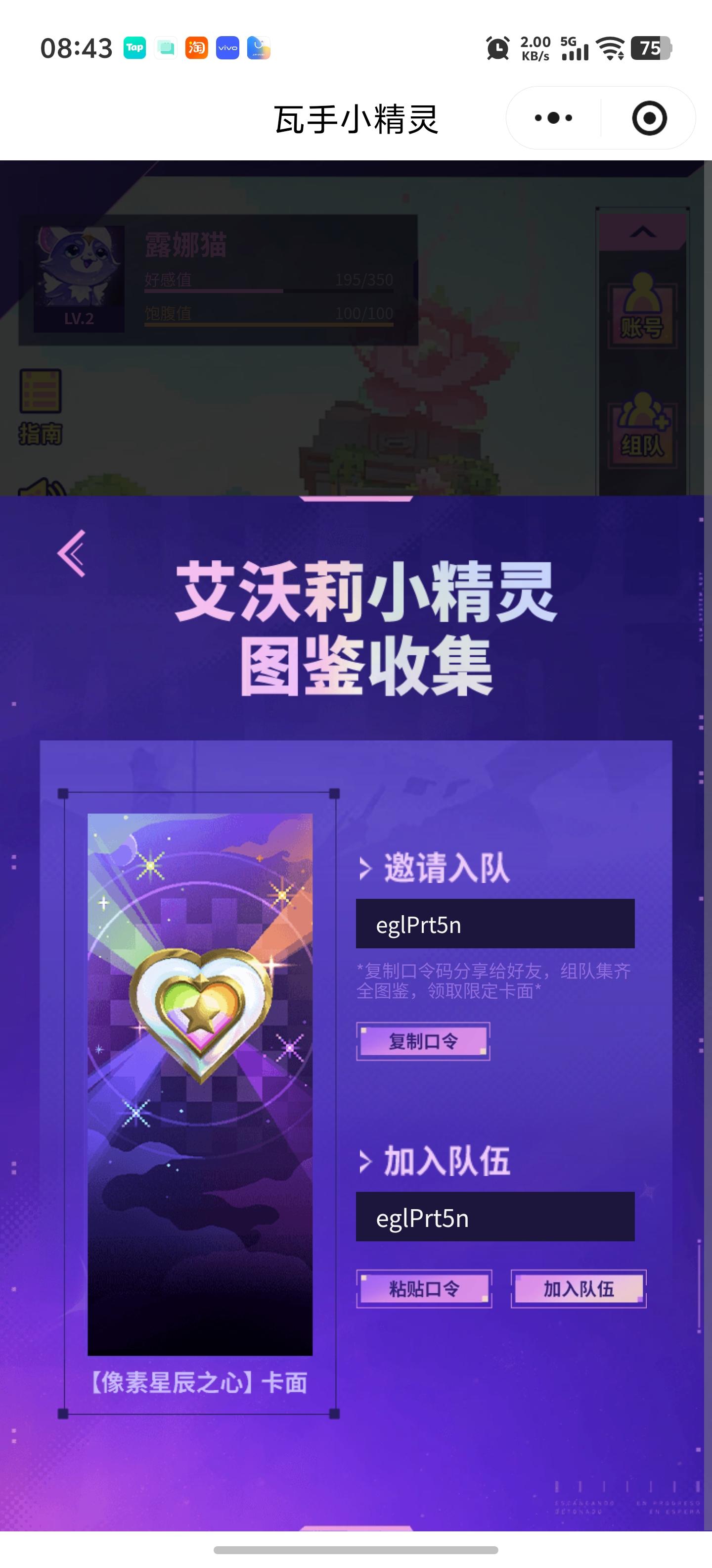 我在【瓦手小精灵】获得了契约小精灵【露娜猫】!小队目前还差太阳鼠/耷拉兔即可全员获得限定卡面,复制口令AUpko52R加入我的小队!