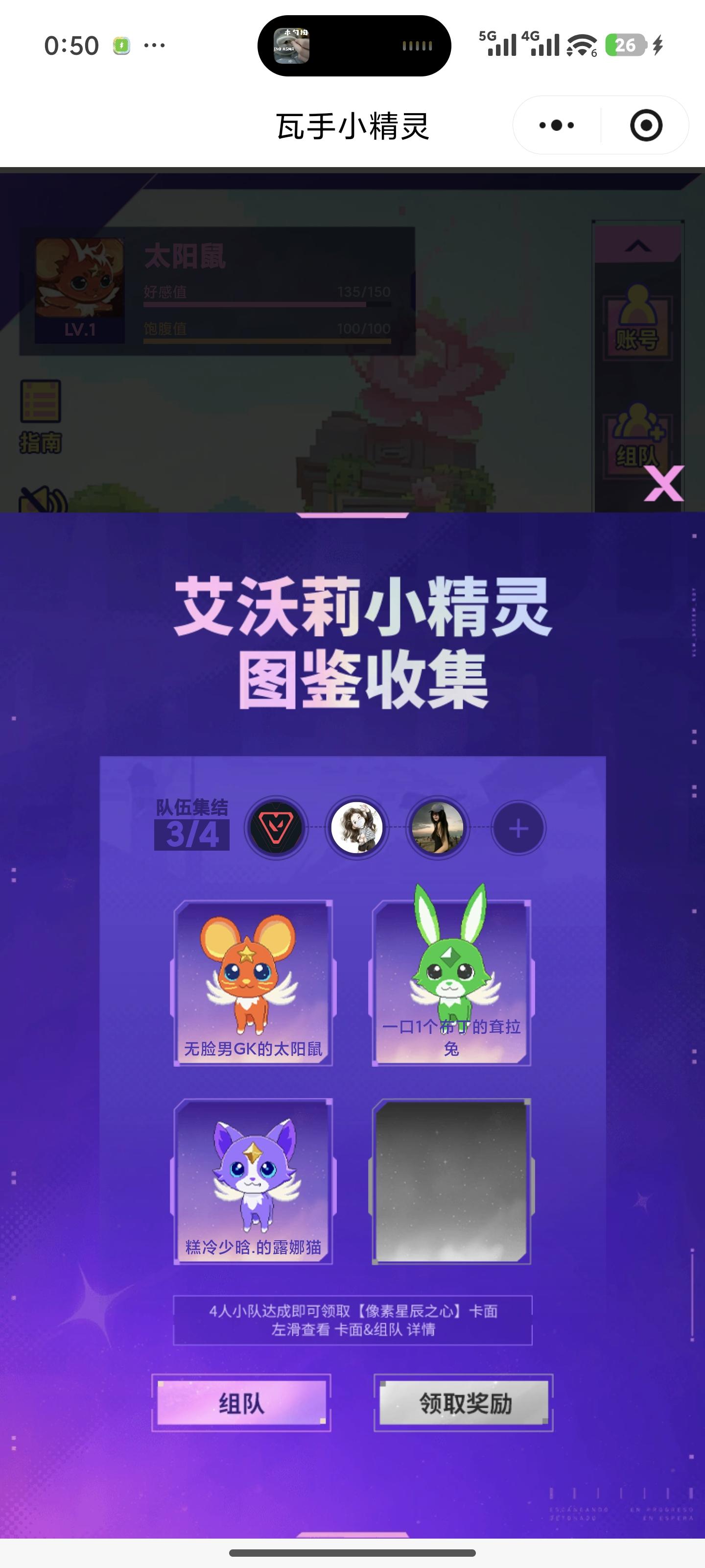 我在【瓦手小精灵】获得了契约小精灵【太阳鼠】!小队目前还差露娜猫/耷拉兔/玛玛熊即可全员获得限定卡面,复制口令TzVKpctr加入我的小队!