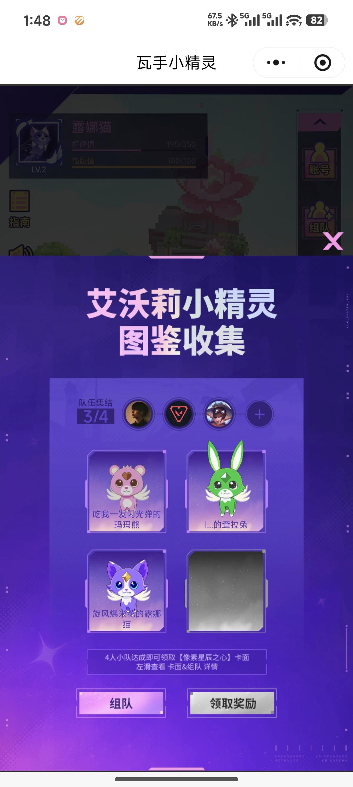 我在【瓦手小精灵】获得了契约小精灵【露娜猫】!小队目前还差太阳鼠即可全员获得限定卡面,复制口令TzTWx734加入我的小队!