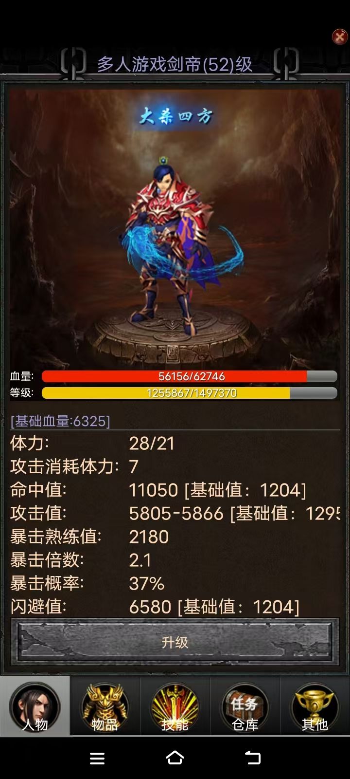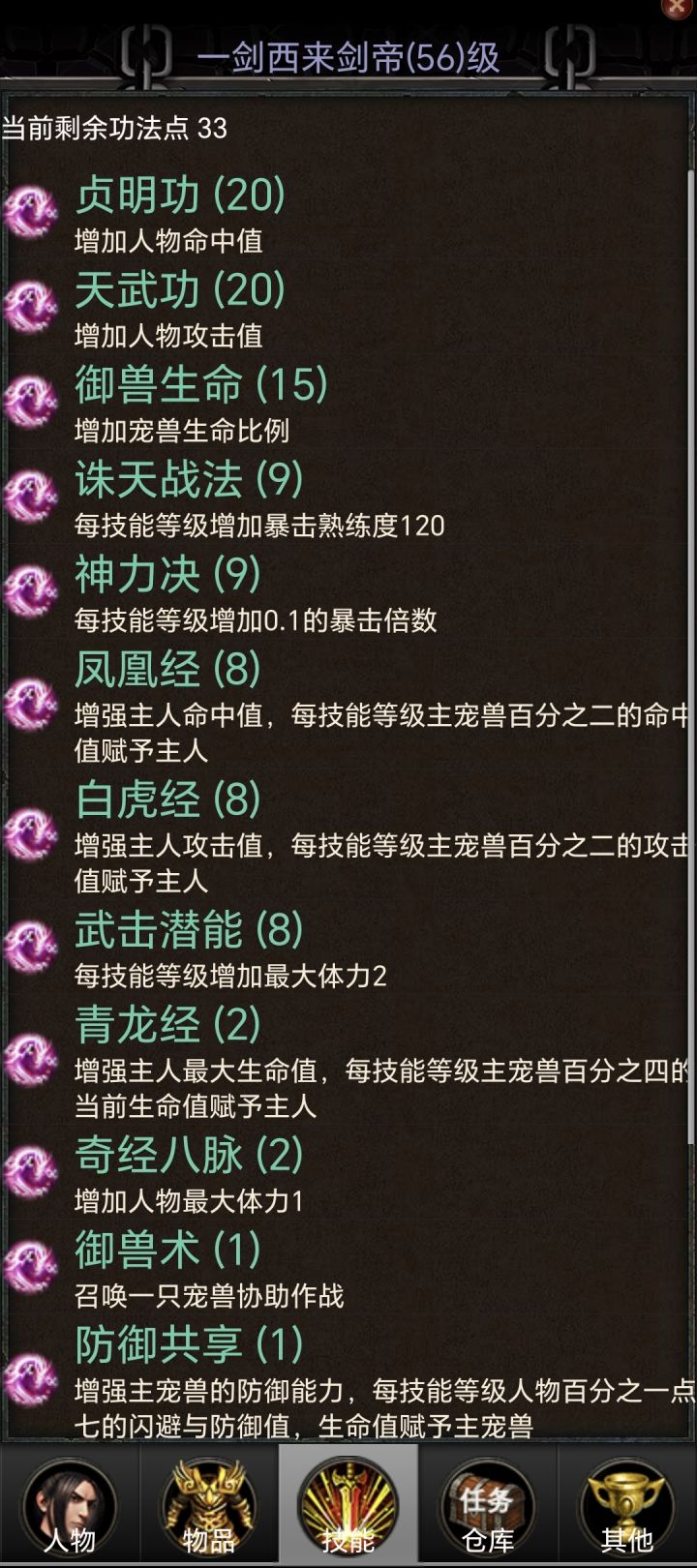 作为一个玩了几款老板游戏的新人总结一下武修的56级攻略开始听从大佬们的建议选择玩武修,感觉一路玩下来确实还不错,基本技能是最实用的。开始先接掌门任务,然后去左边打最低级的怪,只要爆出装备就带上,选择最好的换,打完这个怪能爆出最好的装备后就换一种怪打,新手地图爆率很高(主要是前期有一定次数的怪爆率高)。新手地图刷一套后就去过第一个任务,然后去打摄魂石(地图右下鹿爆,技能升级必需品,也是装备强化必需