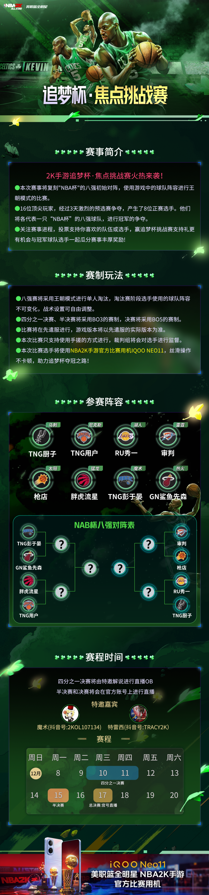 各位全明星们,NBA2K手游首个王朝队套赛——“追梦杯·焦点挑战赛”即将正式开赛。参与游戏内活动,关注赛事进程,投票支持你喜欢的队伍或选手,赢追梦杯挑战赛支持礼,更有机会与冠军球队选手一起瓜分赛事丰厚奖励!