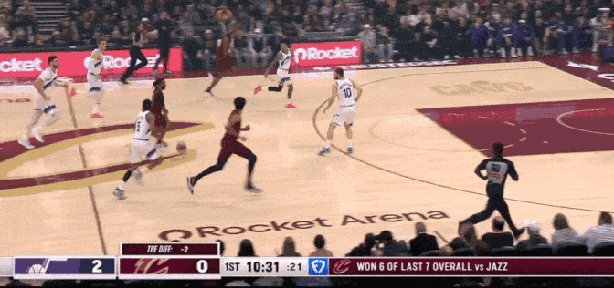 NBA常规赛,骑士对阵爵士的比赛正在进行中。【加兰空接连线阿伦】起飞🛫加兰反击持球推进,吸引防守后将球高高抛起,助飞阿伦单手大力空接终结。