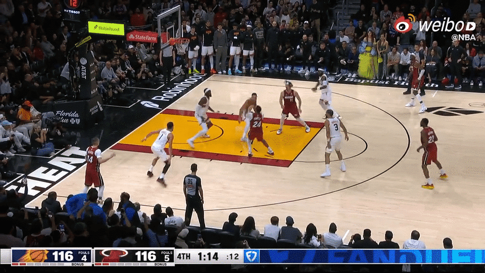 今日NBA常规赛,热火主场对阵太阳。 【鲍威尔关键球屡屡得手】鲍科比!关键时刻强硬接管,末节决胜时刻,鲍威尔兜到罚球线附近干拔中距离命中,接着又底角三分一箭穿心!