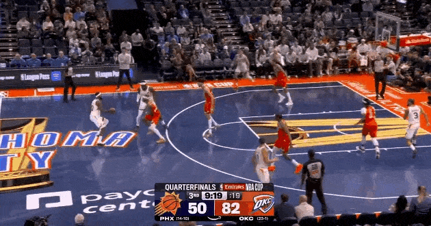NBA常规赛,雷霆对阵太阳的比赛正在进行中。第三节比赛中,亚历山大掏球抢断反击打进拿到21分,雷霆已领先太阳36分。