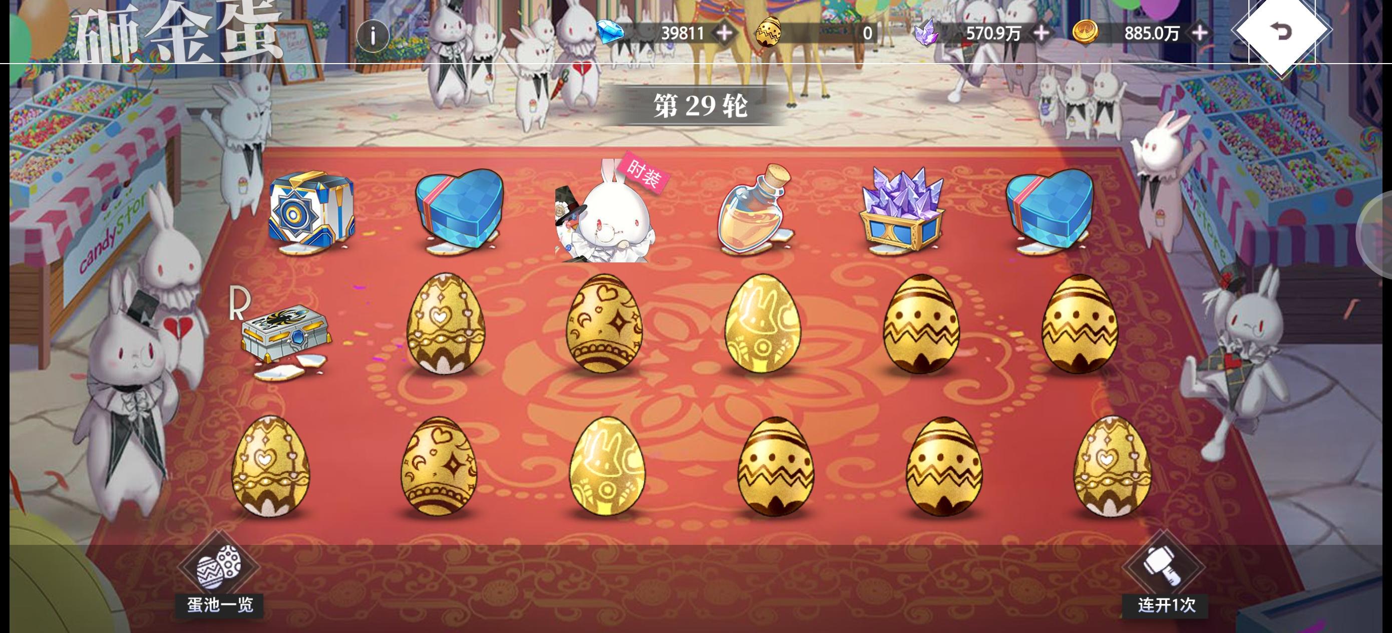 砸蛋活动砸完了,很爽,还开了6个皮肤赚了50皮肤卷又出了个双簧,可惜没尘升了哎,还是基础卡。。。郁闷