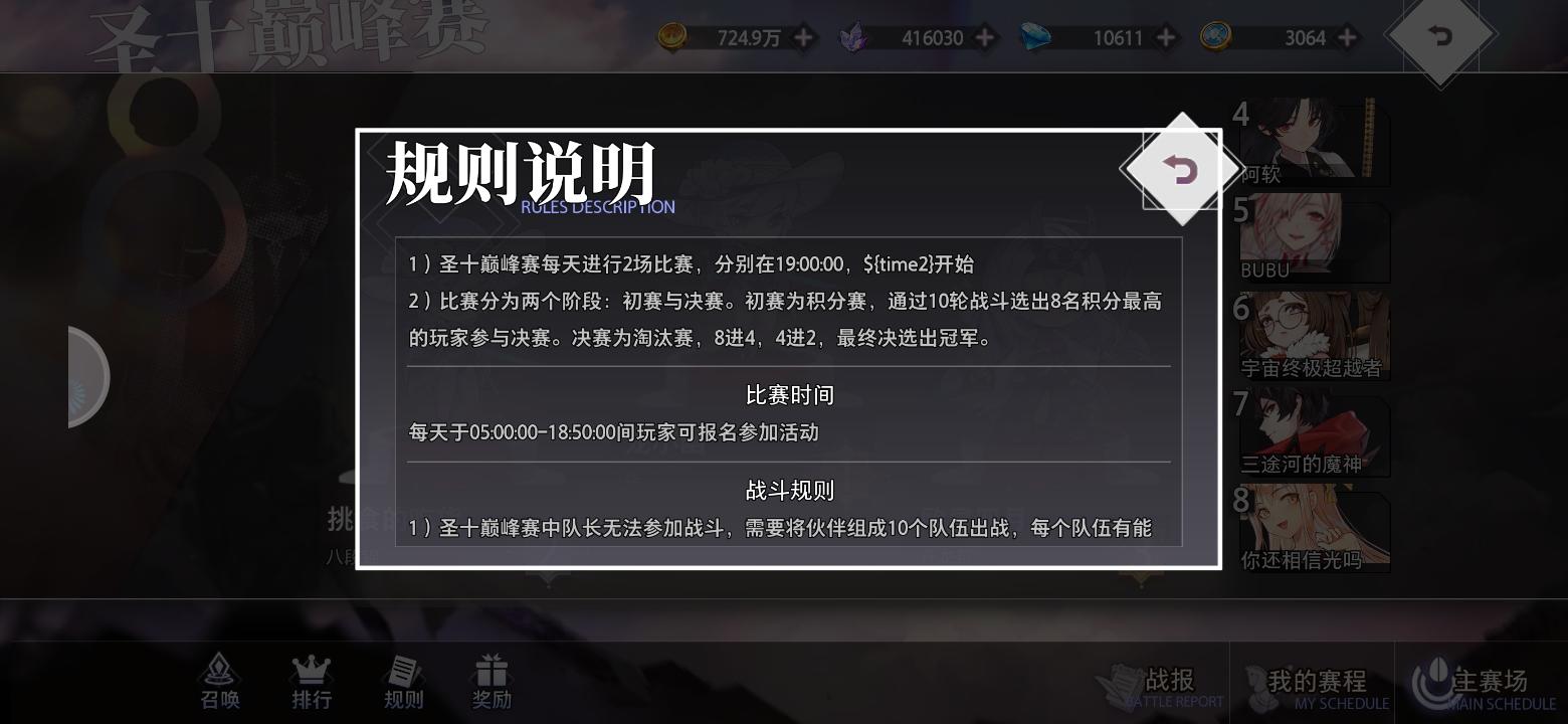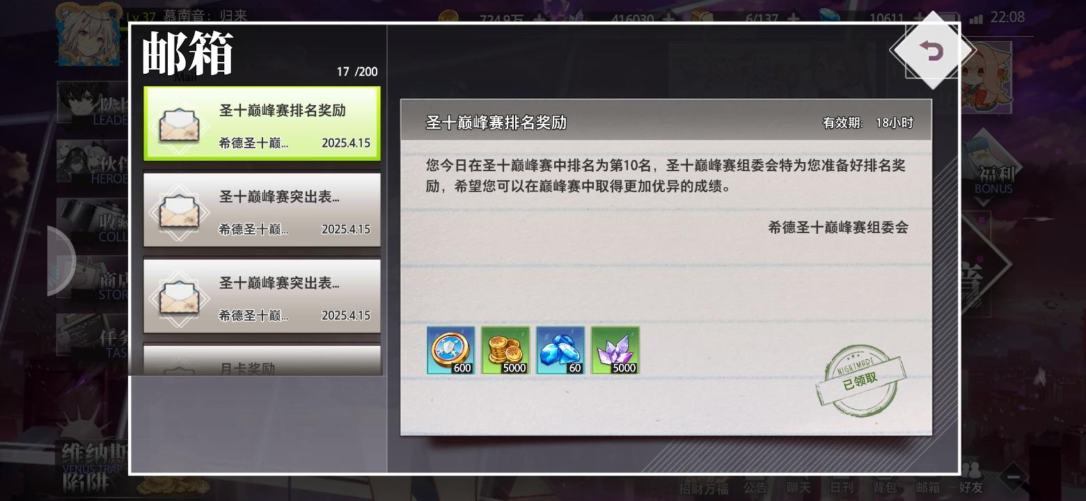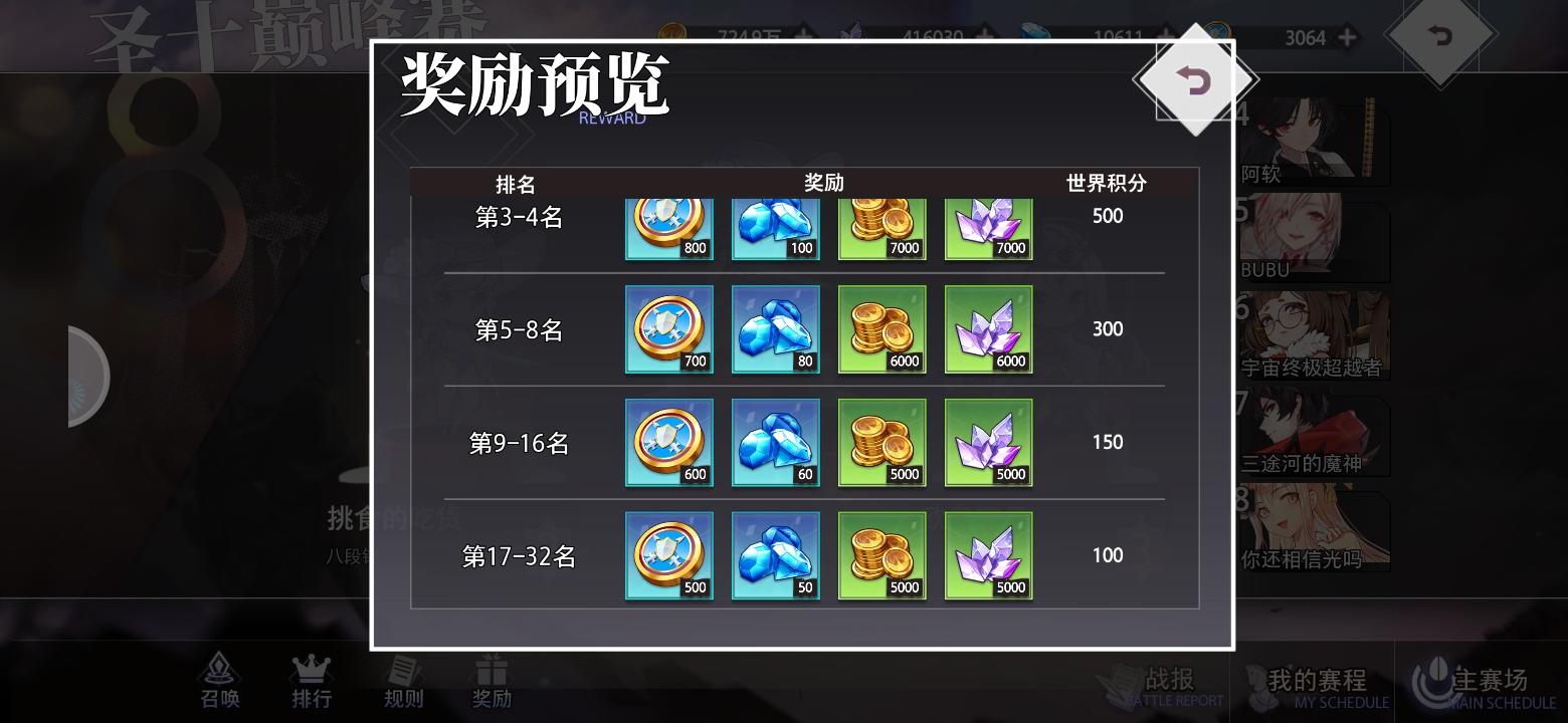 是我是我,13区(坍塌梦境)的慕南音:归来(id:59532)芜湖,圣十巅峰赛今天开启了,路边一条的我在服内战斗拿到了第十名的优秀名次,并且入围了两场精彩对决,获得了这些奖励,而这样的圣十巅峰赛每天都有众所周知,开服已经五天了,圣十巅峰赛也开启了,白天报名晚上田忌赛马,奖励看起来很少,但是每天都有,你游滚服,整区活人到第五天拢共也没有多少,而前3