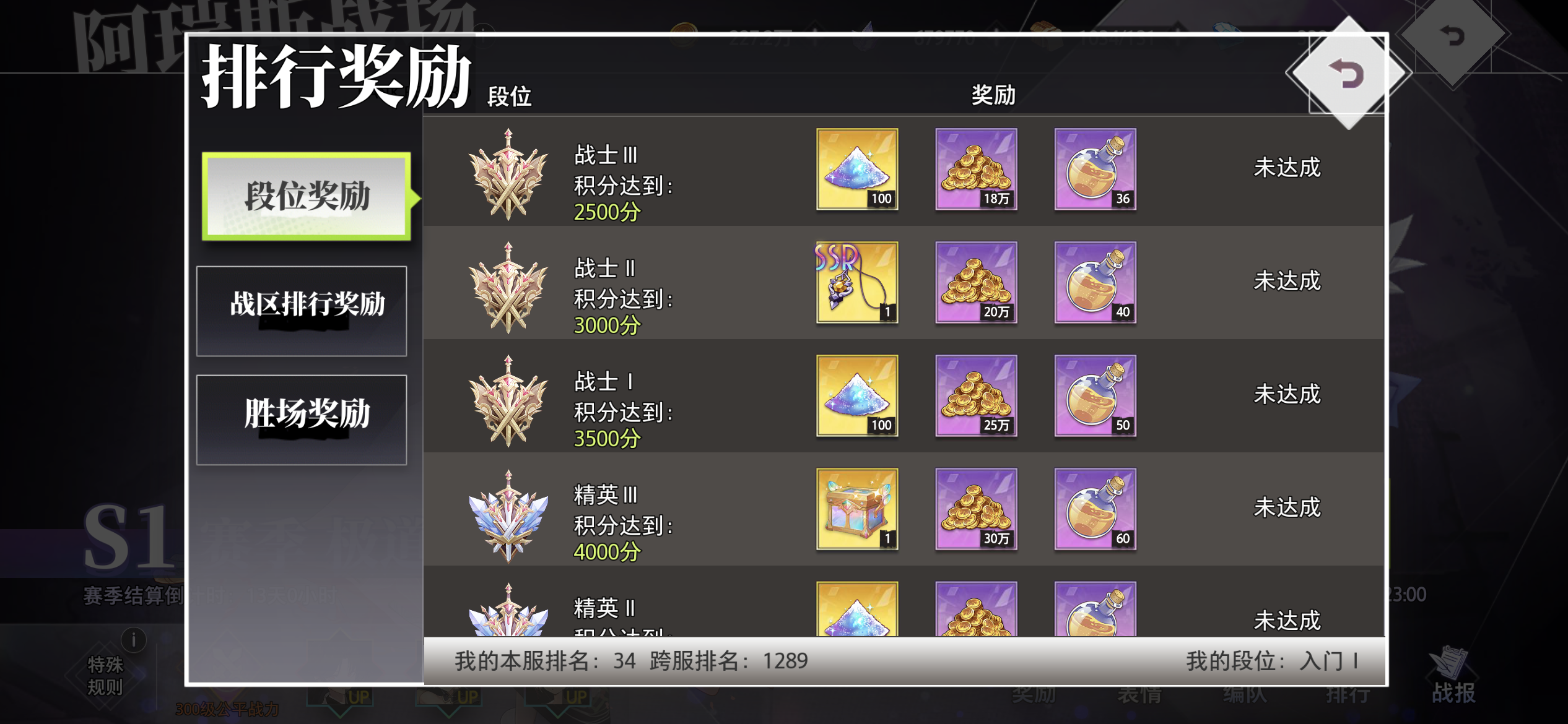 第一天打阿瑞斯战场,排名前50,奖励还不错ID: 14957区服:海底迷城