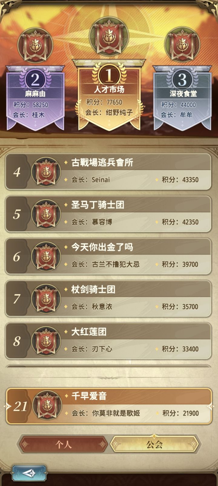 骑士团1期古战场25名,2期SLG36名。有没有上期SLG个排1000前月卡党要跳槽的。群里会发各种工具和配置作业。刻印一更新跑了不少,目前还缺5人。骑士团要求:1.需加群。2.骑士团整体收益奖励活动尽量参与。3.公会活动期间尽量活跃,逆风打半天看情况,优势相持尽量早打制造压力。ID9002466团长Q614473423