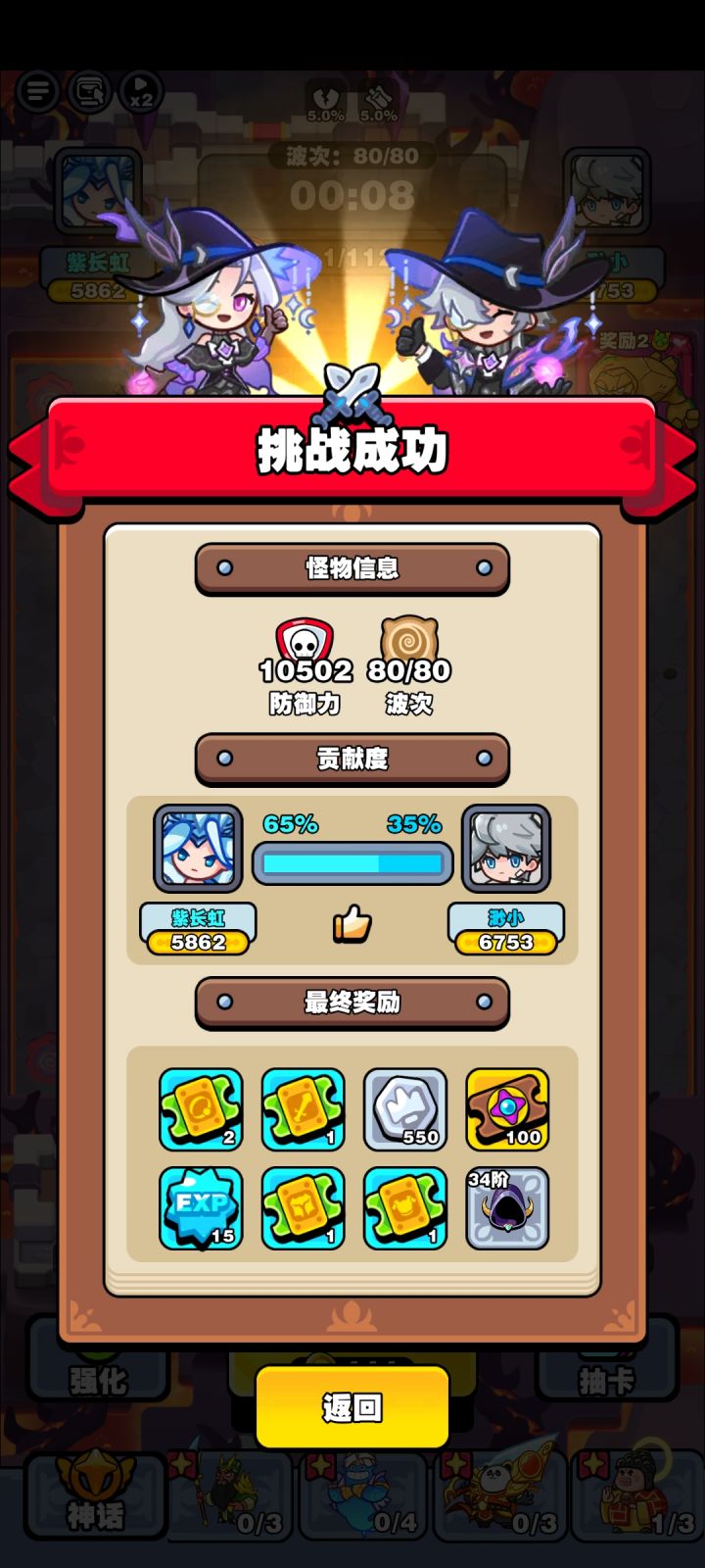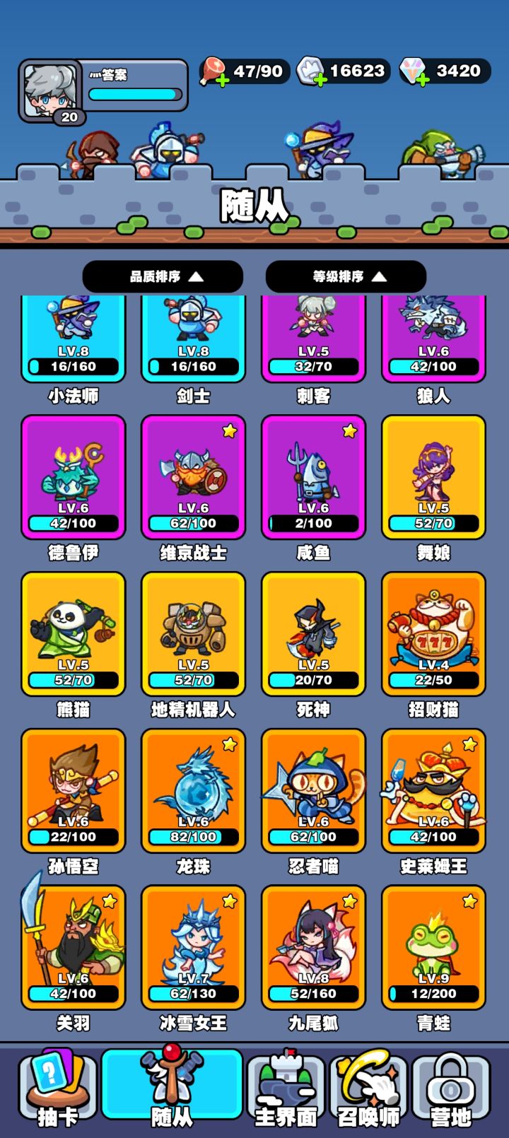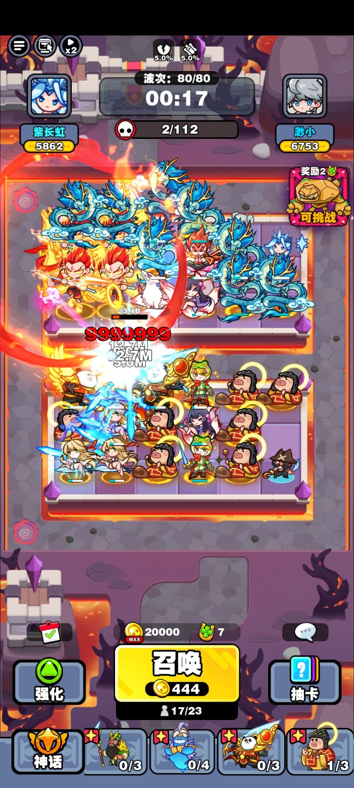 #挡不住的胜利 #游戏功略 抽卡:英雄保底50次(5000招募券)出神话。PS:出现神话记得三倍抽奖,留够900钻石必得。宝物十次保底紫色宝物。五个紫合成金宝物。英雄推荐:神话:青蛙、关羽、孙悟空、招财猫、狐狸紫卡:狼人白卡:哥布林英雄解析:青蛙·拥有变身能力。成功起飞,失败消失。基础25%成功率,9级后邻格有女神话英雄加15%,12级再加10%,综合50%。概率不低,这类游戏本