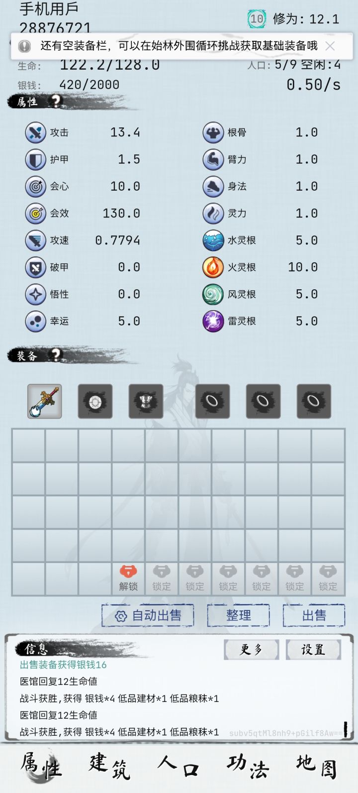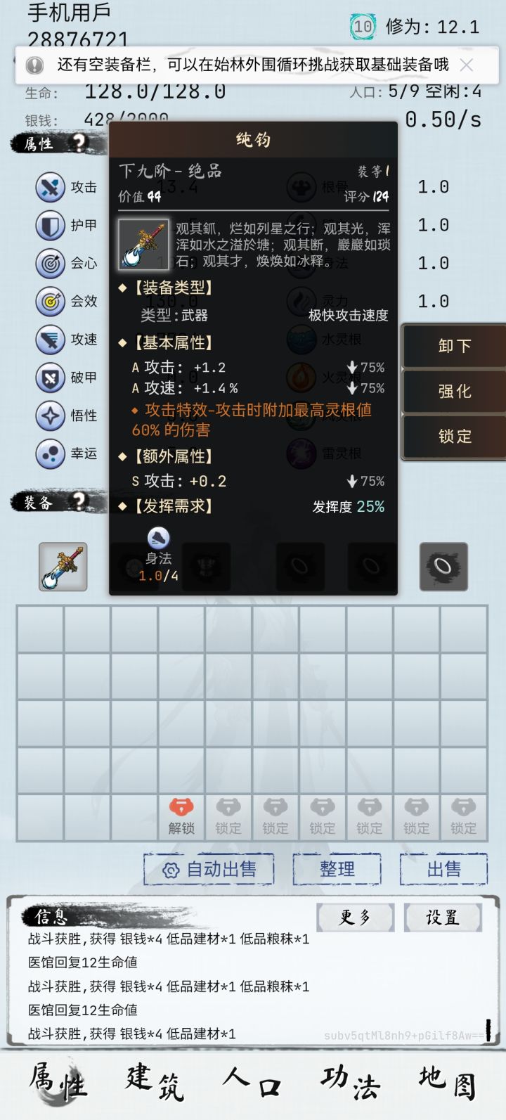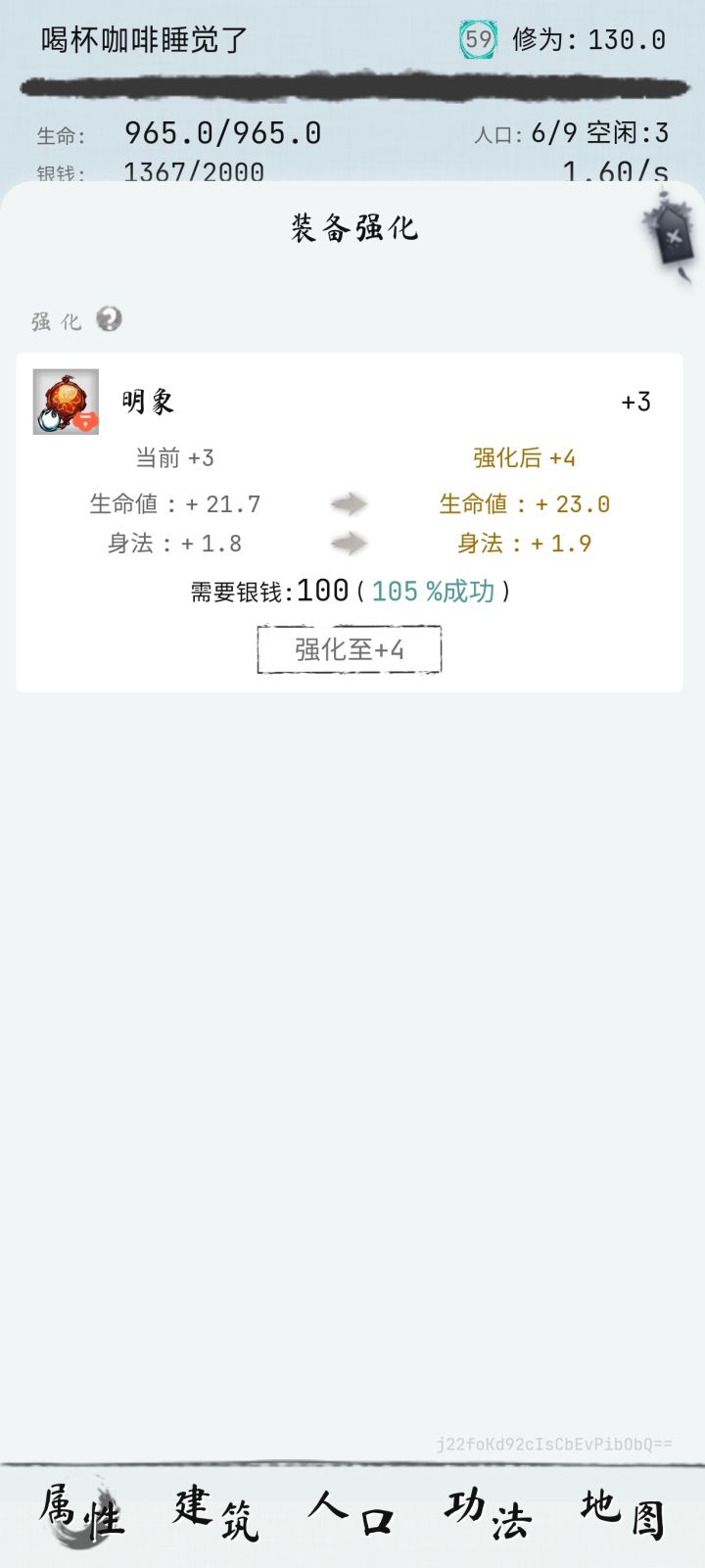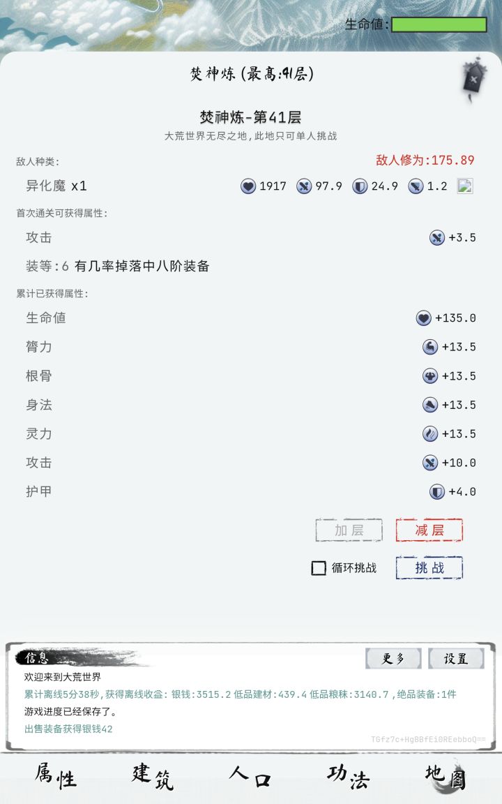 1月1日的版本,版本号1.1.5(1)强化概率102%和105%仍然会失败(之前的版本也有)(2)强化概率远低于显示值(之前的版本也有)(3)时常可见的闪退(之前的版本也有)。如果恰好是在进入游戏的过程中闪退,那就没有离线收益了,嘿嘿(4)练功房生命显示+15,实际+18(5)成就连上连成(强化+5一直到+13连续成功)用不同的+5或以上装备,只要连续成功8次就可以完成