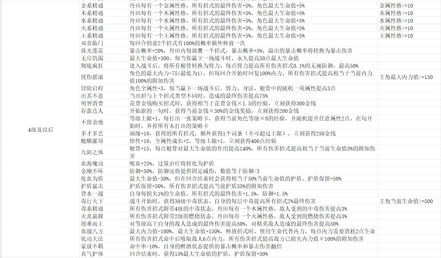 三个挑战模式已经拿下!开始确实很难打,只能不断试错,把传承点打到6就好很多了,除了开始那几把,后面传承点直接爆涨,6点18点过了以后直接就76点了,开局内力恢复非常少,我都是点的特殊启蒙,选的内力恢复,加盾,再加上刀剑天才补个伤害技能,有这两个传承后天赋异禀必拿,刷个越战越勇出来,搭配浪击刷臂力,镖师剑法出伤害,图二最左边那四个是两个斜的火,只要出招就加臂力,两个一次加6点主要怕和其它格子挨着内