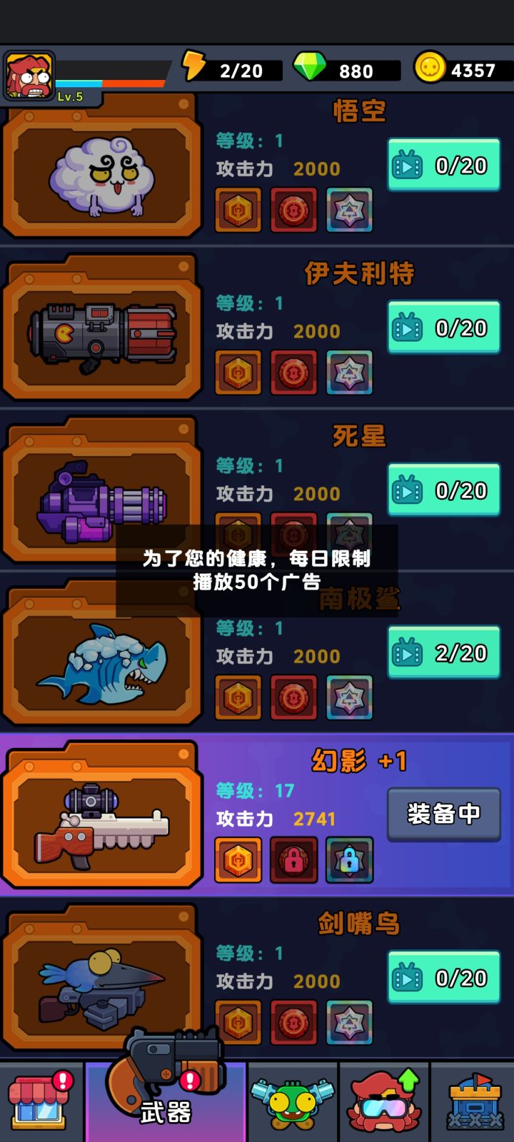 #差不多僵尸 作为一个小游戏资深老玩家,给新入坑的小白提供几条有意义的建议。 首先就是关于广告这个问题,这也是我们平民玩家最关心的一问问题,亲自测试一下一天能看50个广告,所以说如何正确妥善使用广告的次数也尤为重要,个人建议是可以把武器搞一把,二十个广告就能换一把品质目前最高的武器,至于换什么,看每个人的喜好。 武器对应不同属性和技能,我是比较看好狙击枪之把的分裂技能,分裂技能的说明就是击中