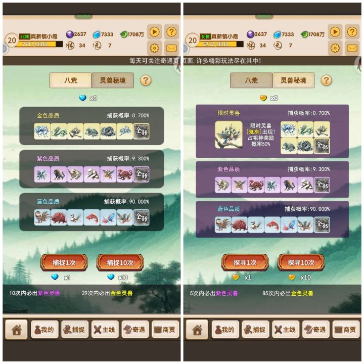 玩了两天,摸索状态,不喜轻喷关于新手玩家对于神兽的选择和培养神兽目前分为三个档次金色-紫色-蓝色,获取方式主要为捕捉,分为普通和限时卡池所需的蓝心和金心可以通过商店通过灵石购买和关卡通关后的资源兑换,后边会插图灵兽如何选择,零氪微氪玩家前期可以优先使用高星级的蓝色神兽为主选,(金紫蓝每个档次的神兽都可以升星6次,星级越高基础成长和额外成长就越高)欧皇玩家氪佬玩家除外,那个