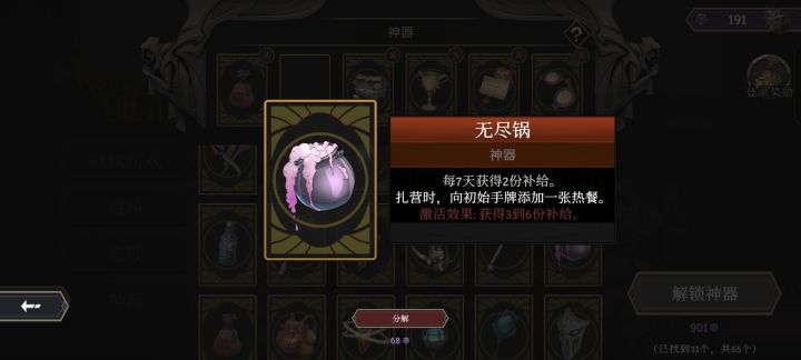 我看到更新了版本,就新开了个存档试试,永恒宝石之类的BUG倒是修复了,但是无尽锅的BUG还是没有修复,我上回提到无尽锅的是第一个词条无效第二词条有效,这回更新后发现,第二个词条依旧有效但是第一个词条依旧无效,地图走一个点就是一天,我试过了,无效,还是不给补给,我又花钱连续在老板娘那里休息7天,依然不给补给