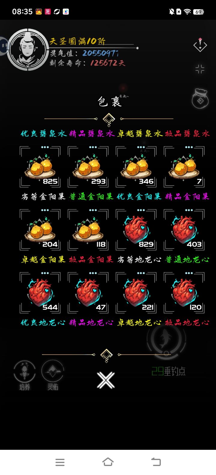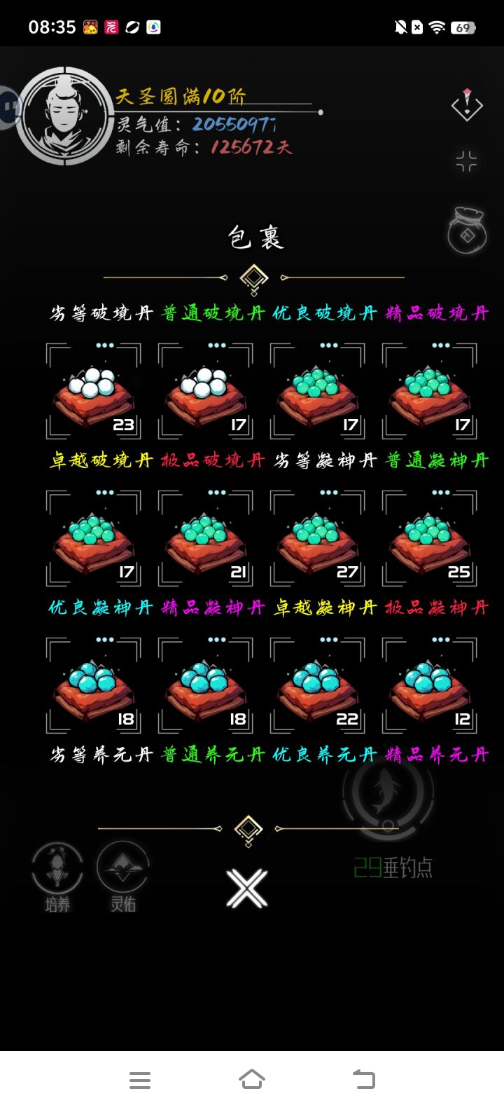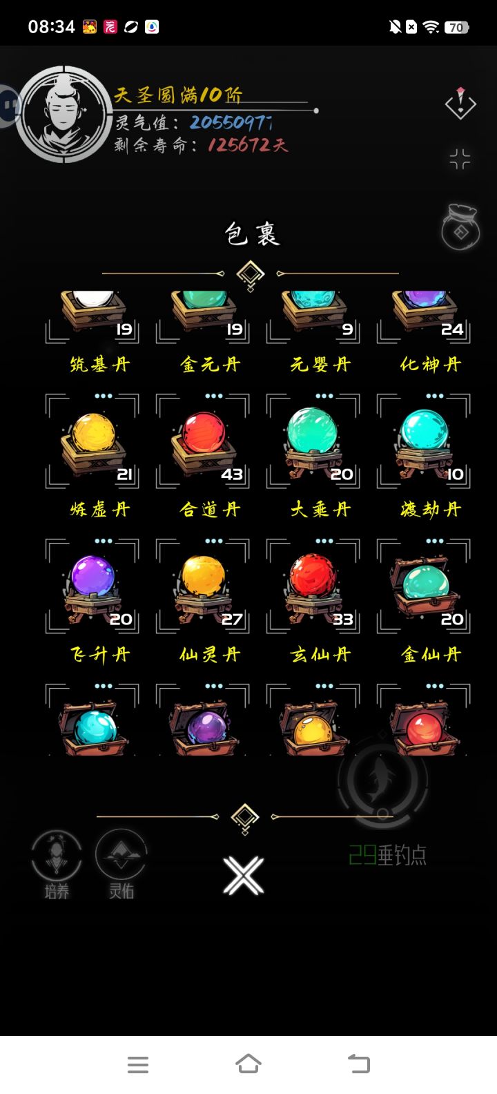 渡劫期已过,飞升成仙就在眼前!目前感觉最重要的升级要素就是宠物!非常重要,各种等级的宠物都要来一只,低级的来两只,这样可以保证升级材料不会卡住,其余灵气,世界,游历之类的基本元婴化神期后就不会有啥影响了#亘古垂钓攻略争霸