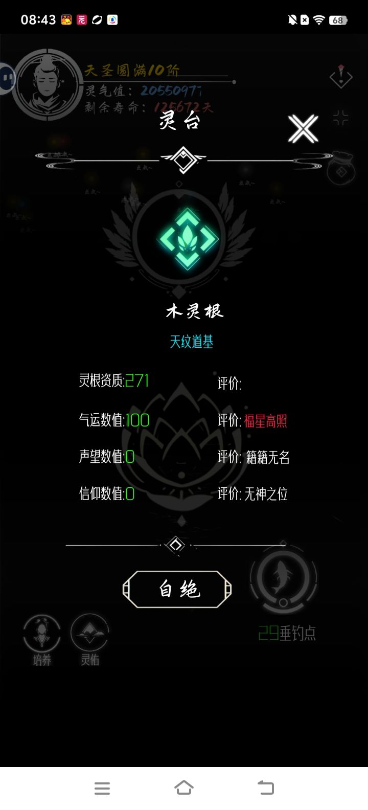 因为游戏正在开发中,很多功能还没有加上,我先初步说几个建号的小攻略,大家可以留言区一起探讨一下1、开局建号福源比灵根重要一点,因为目前福源没有增加途径,灵根在提升境界时可以逐步增加其次世界的破坏程度也很重要,最好彻底毁坏的世界数量在2个以下目前自杀还没有限制,大家可以多刷几遍挑个好的再开始玩2、突破境界时一定要刷满道心,这样突破后增加的灵根与寿命更多,目前游戏不完善,只有突破时点击小星