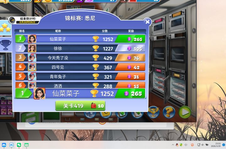 这个挑战是不是太难了,我满级装备,无论食材,还是座椅都是满级了,这个最后一关都过不去,我还用了最贵的道具,用一个加120的金币,我起码试了十几次啊,试了两天,着实有些考验血压了,换道具的钻石都快有50了