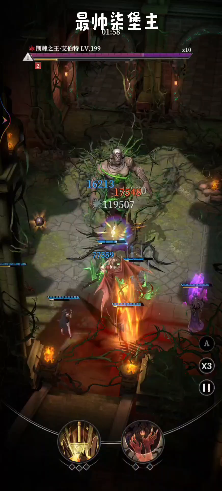 荆棘之王血量少,思路就尽可能在短时间打出控制链与输出。 上阵英雄神力站位如上,缴械或者光弓主输出,最好的装备给主C,海伦娜点出三次无敌,扛不住光弓也可换绿弓多抗几下,除了缴械需要能量套以外,其他随意。#地下城堡4骑士与破碎编年史