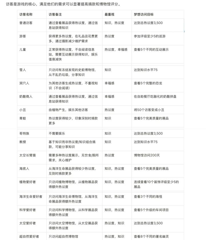 ⭕️热议度- 定义:热议度 是访客对展品的热情,类比前作的“声誉”,可以通过投资装饰和组织巡游来增加。更高的热议度意味着更多人谈论博物馆,吸引更多访客并增加捐款。- 如何提升:通过精心装饰展品、确保展品质量为“完美”、组织引导巡游,以及保持博物馆的清洁和吸引力。- 重要性:热议度是收入和访客流量的重要驱动因素,尤其对某些访客类型(如游客)至关重要,他们更关注 热议度水平。⭕️知识- 定义