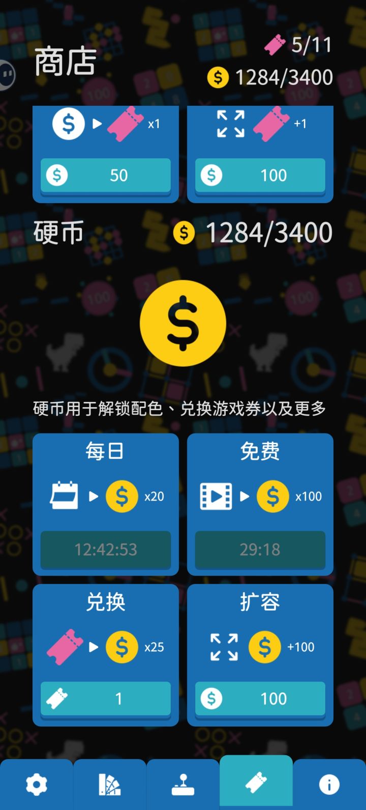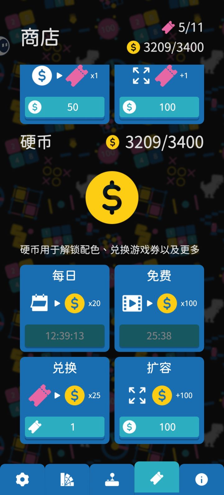 如图,当看过三次广告解锁无限复活券之后,用复活券兑换硬币也不消耗复活券不过说实在的目前硬币好像也就像我这种想玩编辑器的会攒一下(拜托不要删我档)
