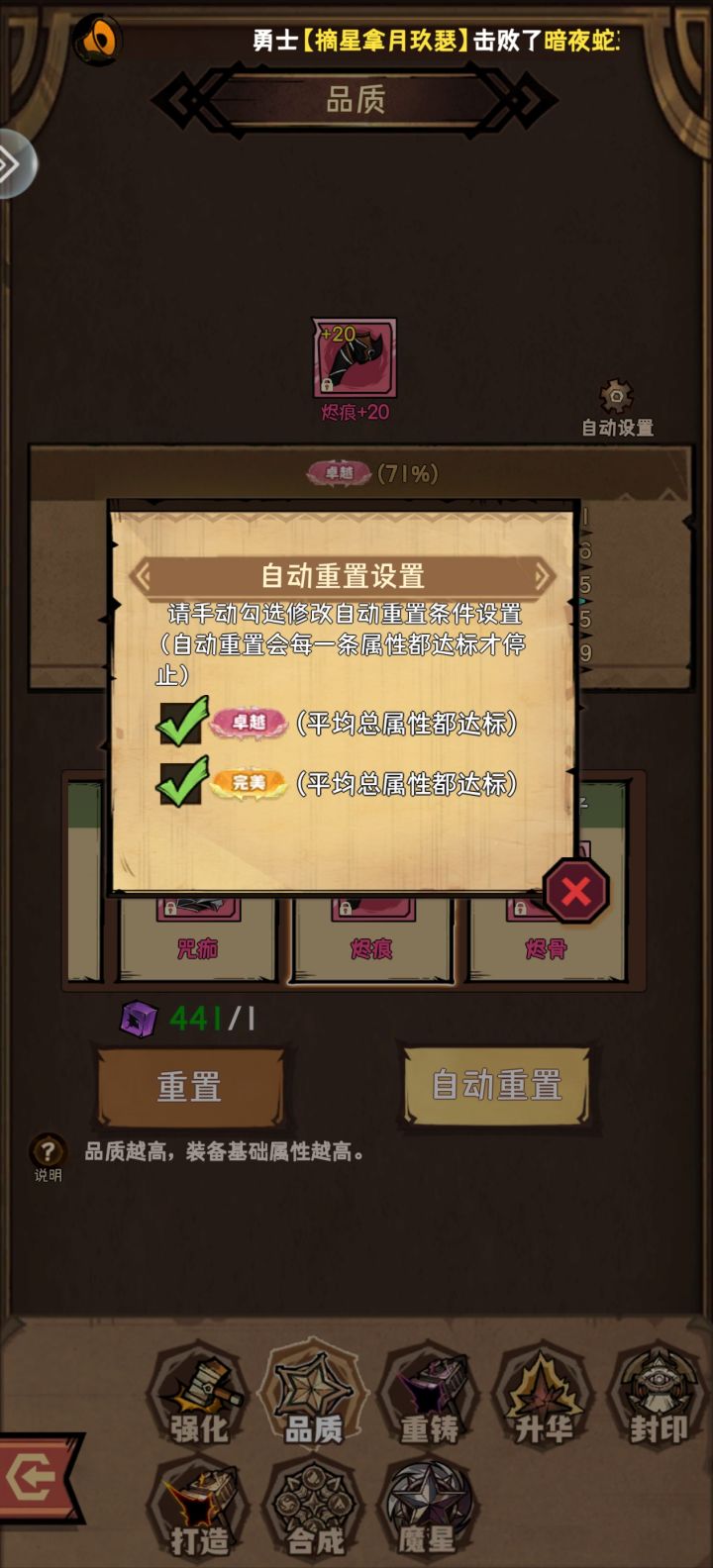 1.品质重置需要一下一下按,很麻烦,建议调整成设置固定品质以上自动消耗品质石。2.重置新品质被“重置品质成功”六个字挡住了,看不清是什么品质,也影响刷新装备品质的效率,建议换个地方。优秀品质被重置品质成功六个字挡住看边角跟完美颜色很相近。