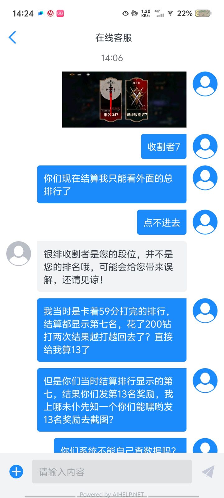 死斗最后一秒都显示是第七名,结束后的段位结算也是银绯收割者7,结果邮件发来是第13名奖励,联系了客服开始直接不认账,说段位代表不了名次,要不是我天天打死斗我还就真信了,找了群里一位朋友的图明显前十名是和银绯收割者段位对应的,这能不认让真是好样的,就这个态度祝早凉哈#银与绯招募 #银与绯 #银与绯6