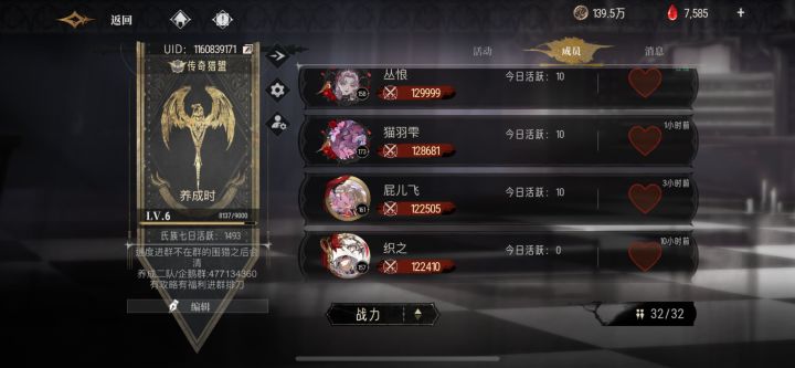 招人啦!!本氏族围猎稳定排名在1.0%~1.9%,主打围猎,围猎次较少或不打结束会踢要求活跃任务7以上,13万战力以上直接申,氏族uid:725286915,离线二天以上会清人♡(*´∀`*),欢迎申请加入#银与绯 #银与绯招募 #银与绯氏族活动