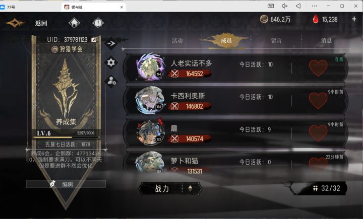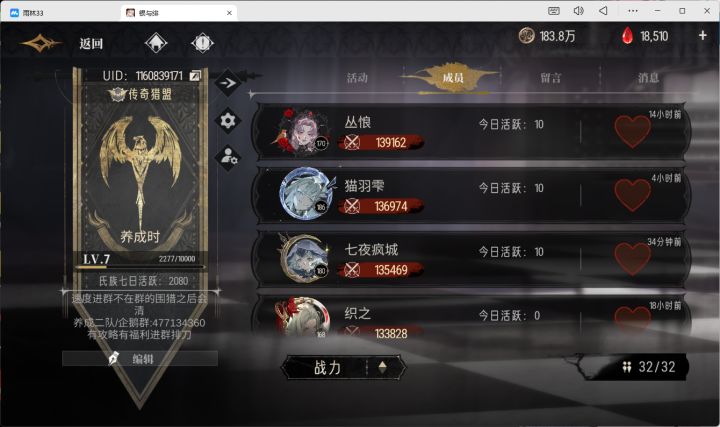 群里活跃团结友爱 如果你无家可归或者在外流浪 没有地方打围猎可以看看我们家 上期参加的1235会均有排名 (可以看我的过往帖子也算养成成长史了) 现为4会(图一)招人 预计围猎前一天收满 不退游不清 虽然上期没参加但满员满刀前50不成问题 有意+企鹅:852075678 直接发个人主页+眷属页面+主队装备