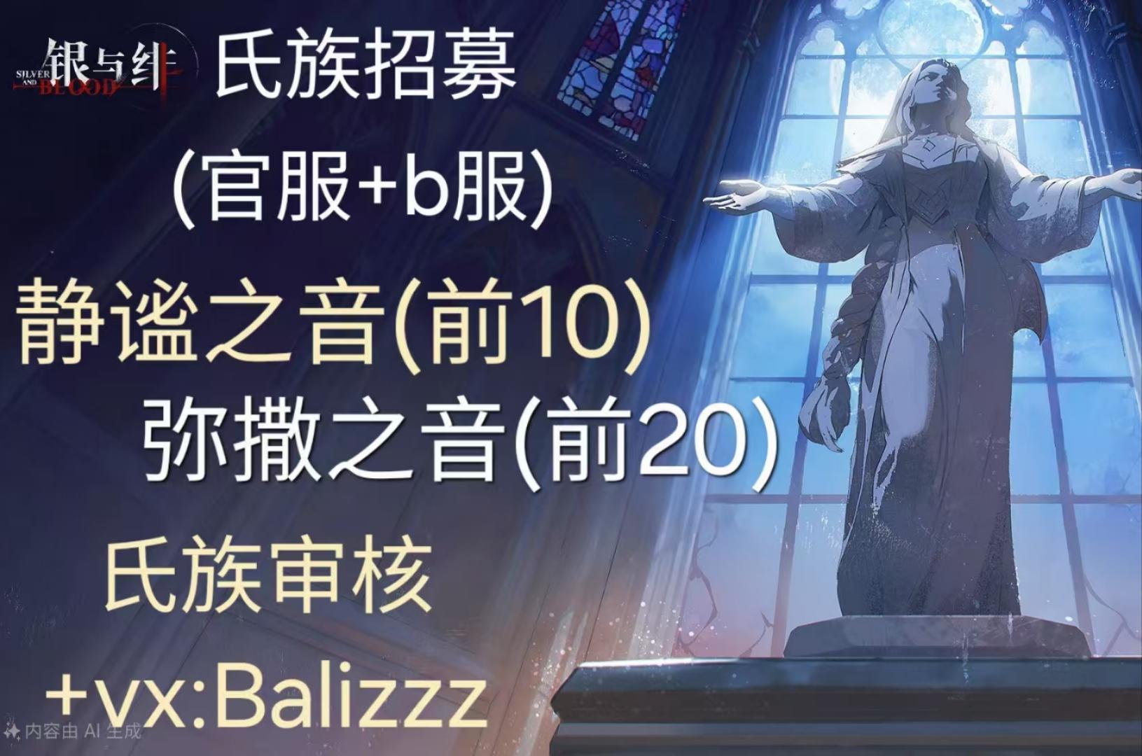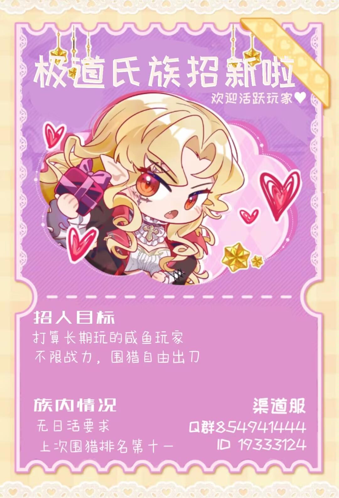 9级氏族招人啦!!围猎上期排名48,主打围猎,围猎次较少或不打结束会踢(˃ ⌑ ˂ഃ ),要求日活跃任务7以上,要求21万战力以上,氏族uid:725286915,离线二天以上会踢人,欢迎宝宝们申请加入#银与绯 #银与绯招募 #银与绯氏族 #银与绯氏族活动 #