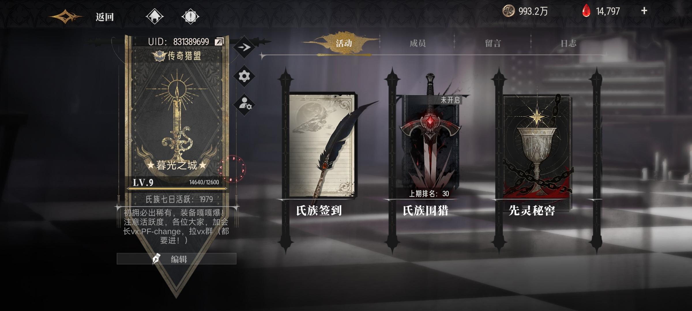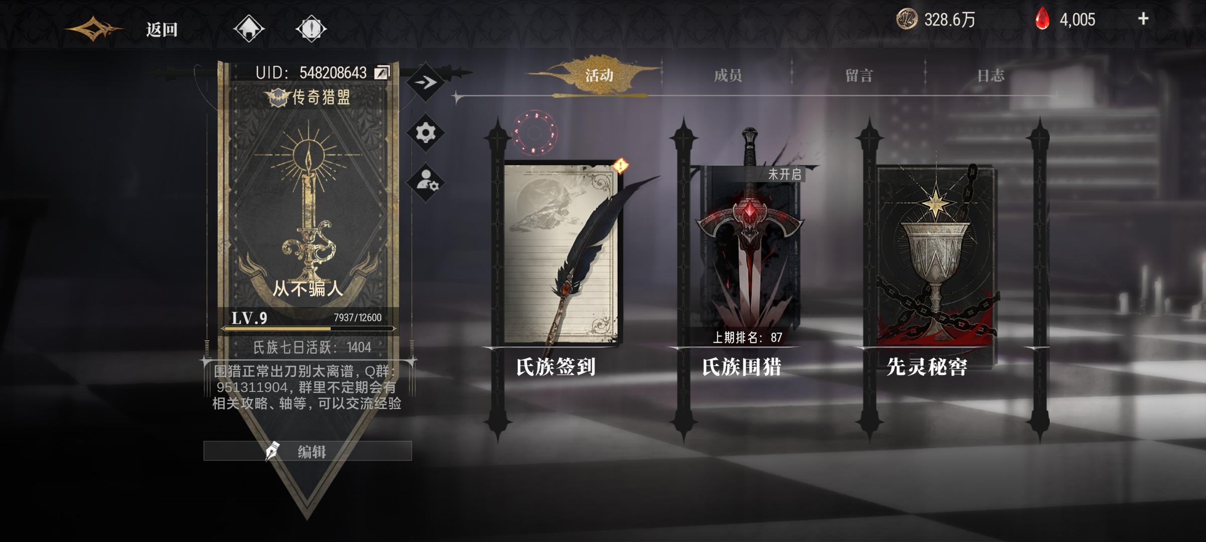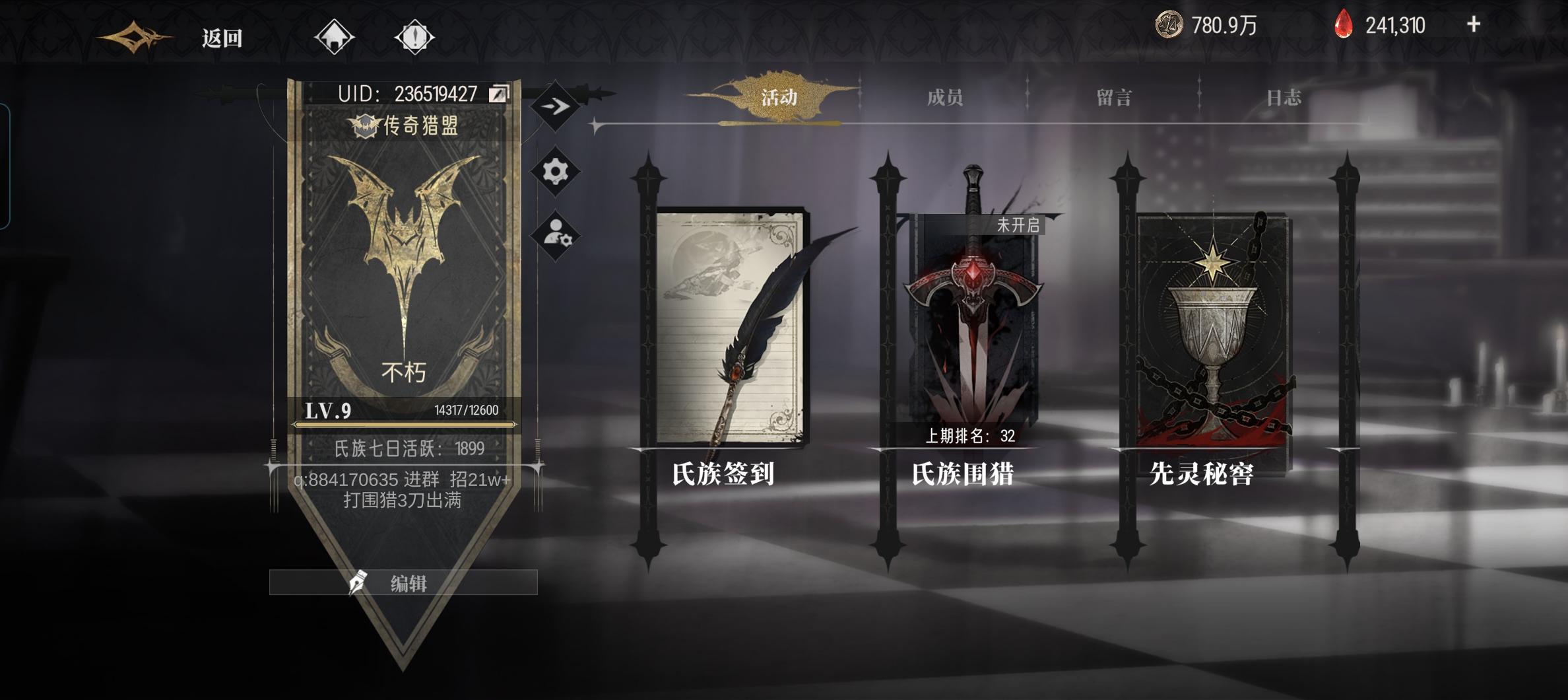 氏族满9级,要求围猎满3刀,日常登录即可,其他无要求,欢迎加入~氏族UID:236519427