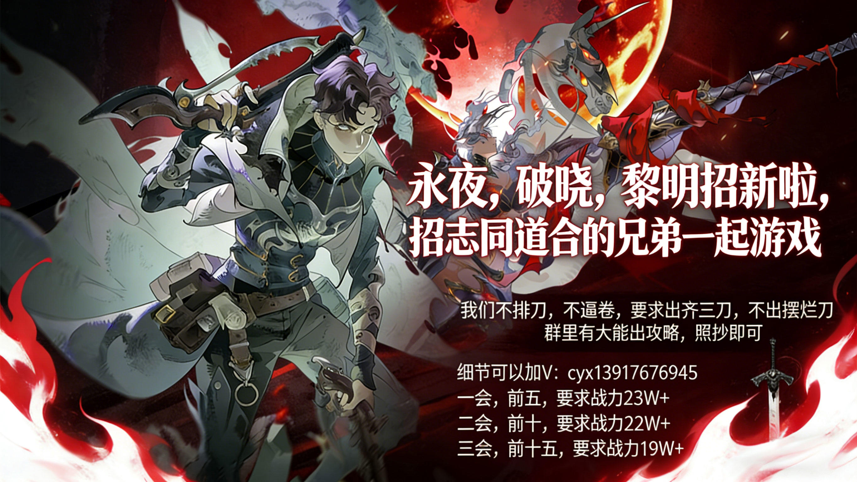 永夜,破晓,黎明招新啦,招志同道合的兄弟一起游戏我们不排刀,不逼卷,要求出齐三刀,不出摆烂刀,群里有大能出攻略,照抄即可下面是基础条件(只要你足够活跃和话痨,就无视任何条件),细节可以加会长V:c47zh98一会,前五,要求战力23W+二会,前十,要求战力21W+三会,前十五,要求战力19W+