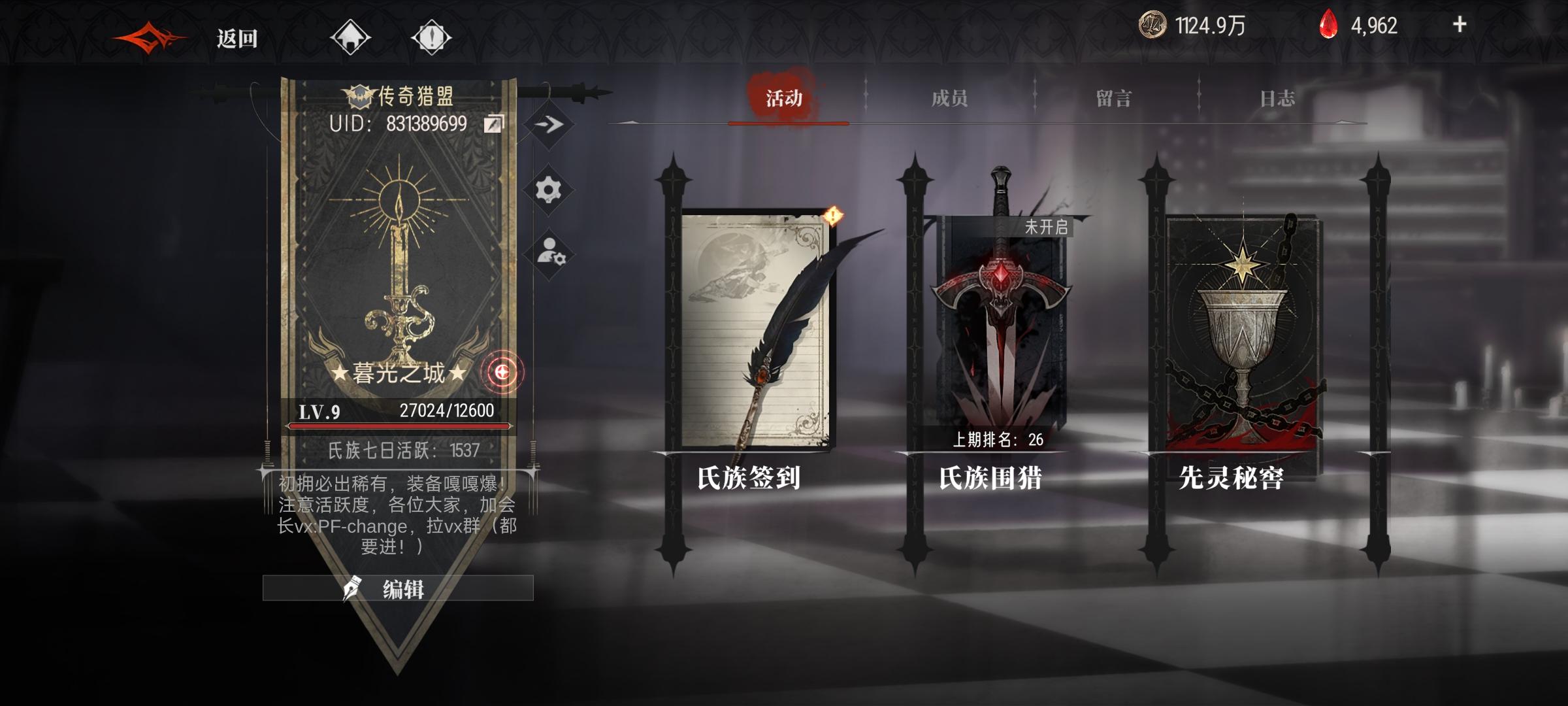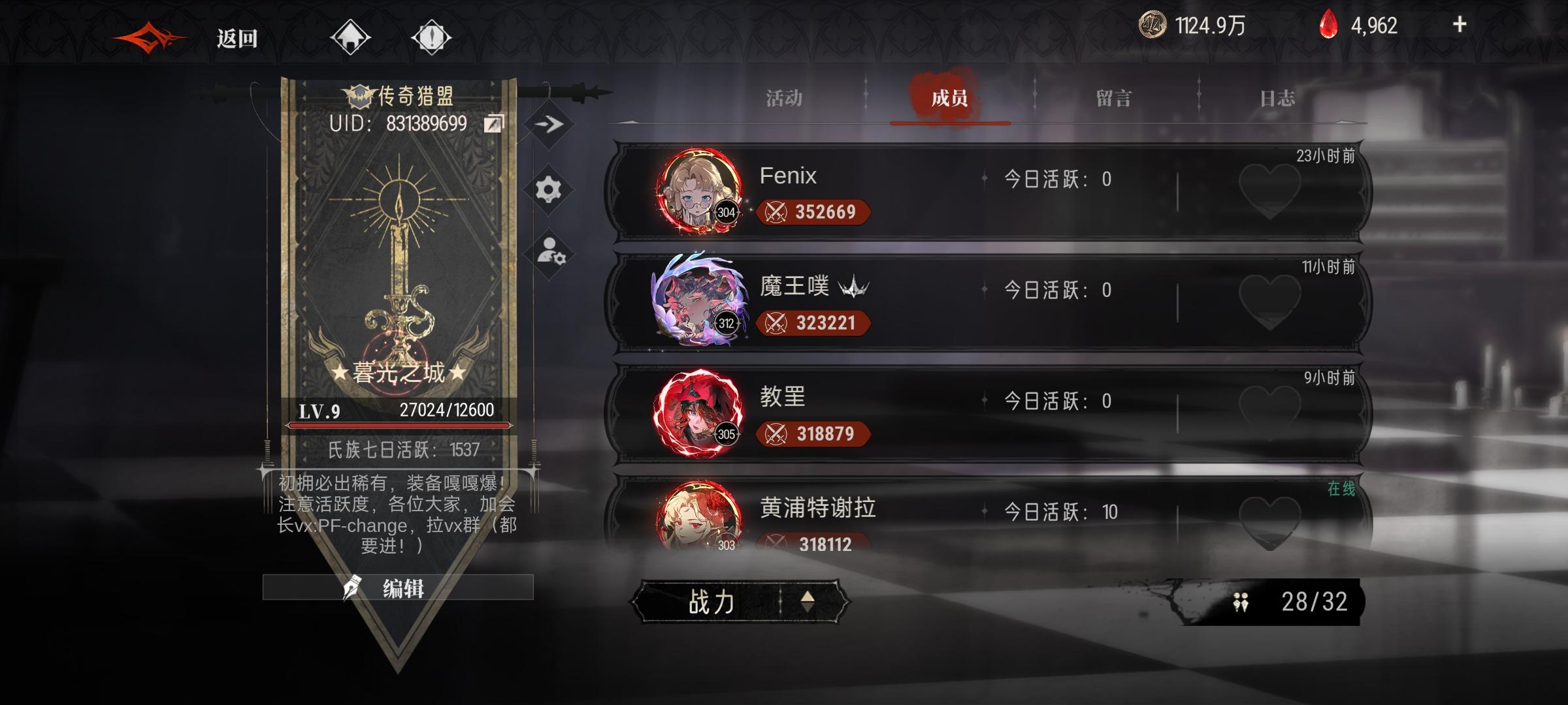 欢迎各位游戏同好,开心享受游戏就好不用申请,直接进入 不用加v群或q群本氏族基本无要求,如下: 1.三天内能上线 2.围猎不要求排刀或凹,自己看着怎么高效怎么打,每天尽量打满三次 有需求可以考虑一下,感谢各位支持让我们的氏族再次伟大 UID:22544387