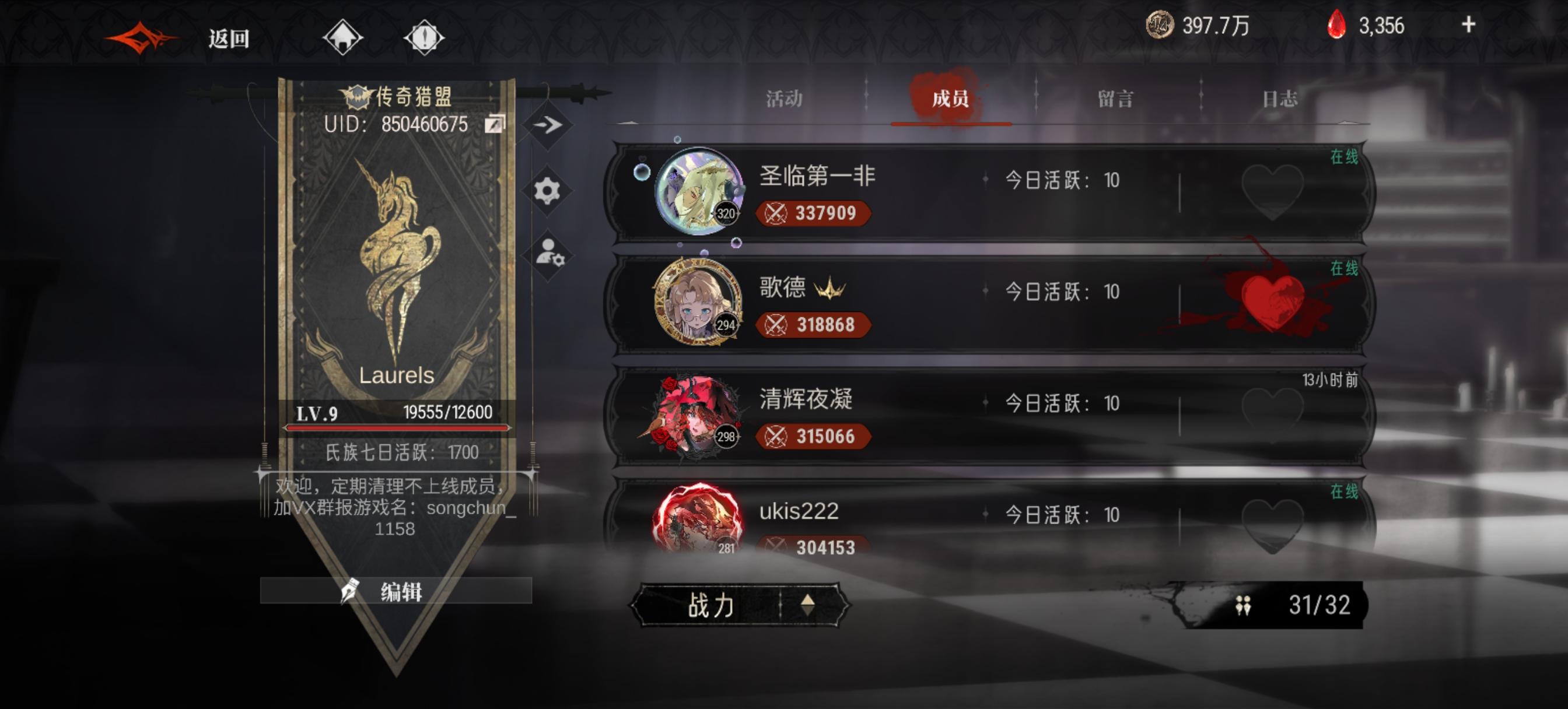 25W以上满活跃的兄弟直接申请,围猎出满3刀即可,离线1天以上或无活跃度会清理,其余无要求